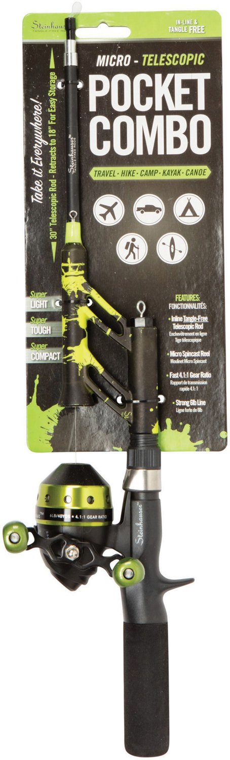 Bring the Lil Anglers Profishiency 30" L Pocket Spincast Combo along with you wherever you go. This light power 30 inch rod and reel combo retracts to 18 inches long for easy portability and storage. The inline feed prevents tangles, so you spend more time fishing, while the EVA grip, fiberglass construction and small size make it easy and fun to use.