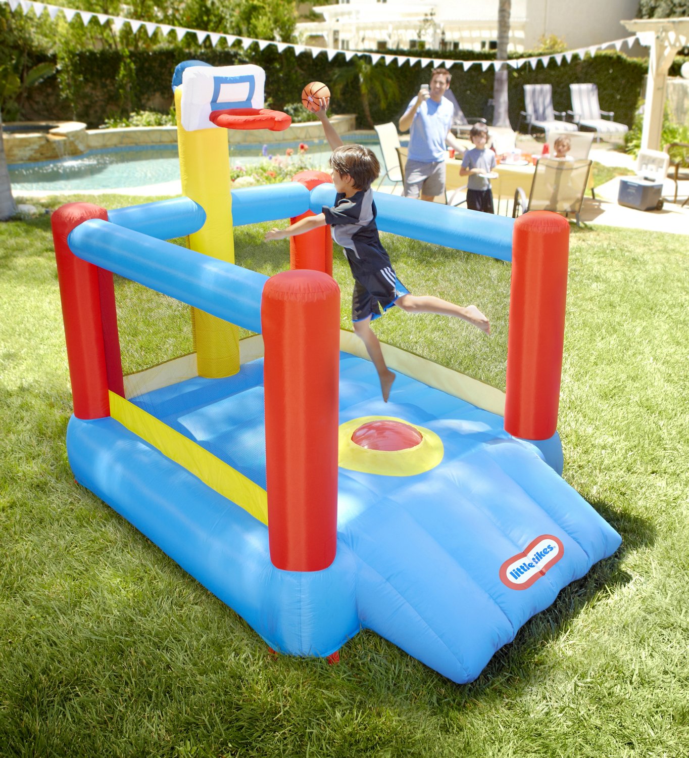 Get kids moving and smiling with the Little Tikes Super Slam ’N Dunk. The inflatable action lets children jump and bounce, and the adjustable basketball hoop allows for cool slam dunks.
