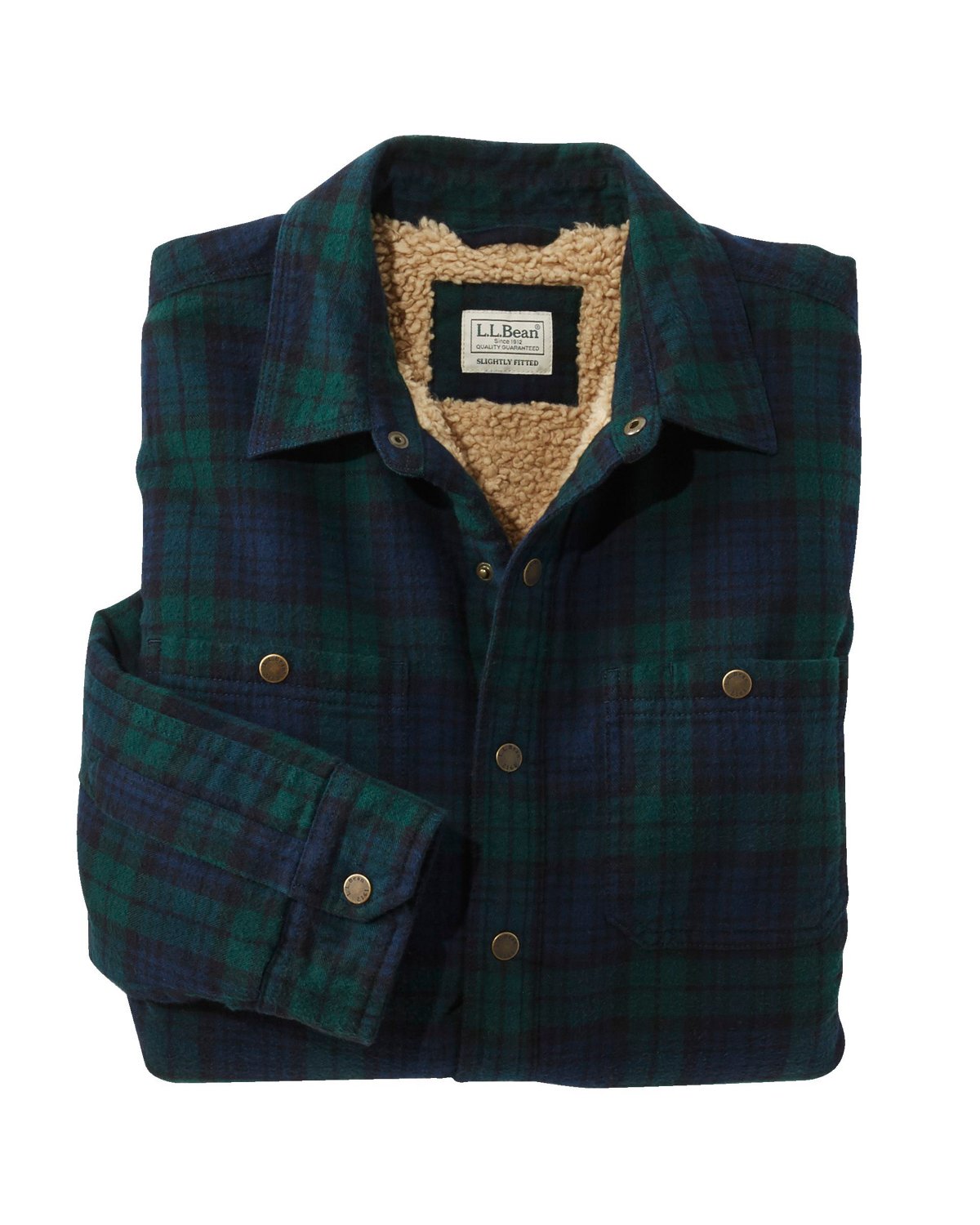 Look your best when you wear the L.L. Bean Men's Sherpa Lined Scotch Plaid Long Sleeve Flannel Shirt. It is made of 100% high-quality Portuguese cotton flannel. The taffeta-lined sleeves create easy layering, and its 2 front pockets with snaps allow you to carry around small items. The shirt is yarn-dyed for long-lasting color.