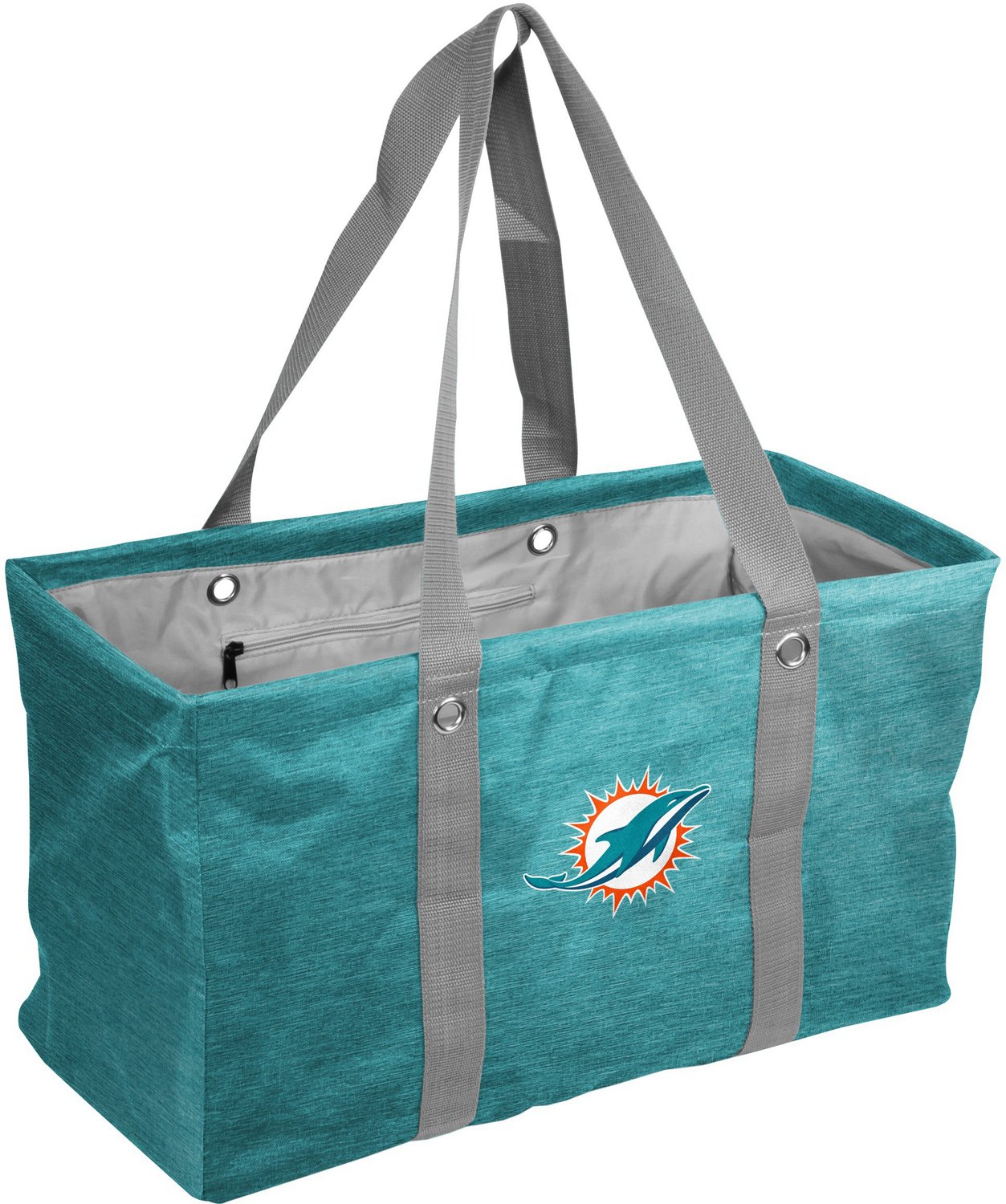 Pack up for game day with the Logo Brands Miami Dolphins Crosshatch Picnic Caddy. The polyester construction affords durability, while the sturdy bottom and wire top frame hold heavy loads. The reinforced handles allow for easy carrying, and the team logo shows off your Fins pride.