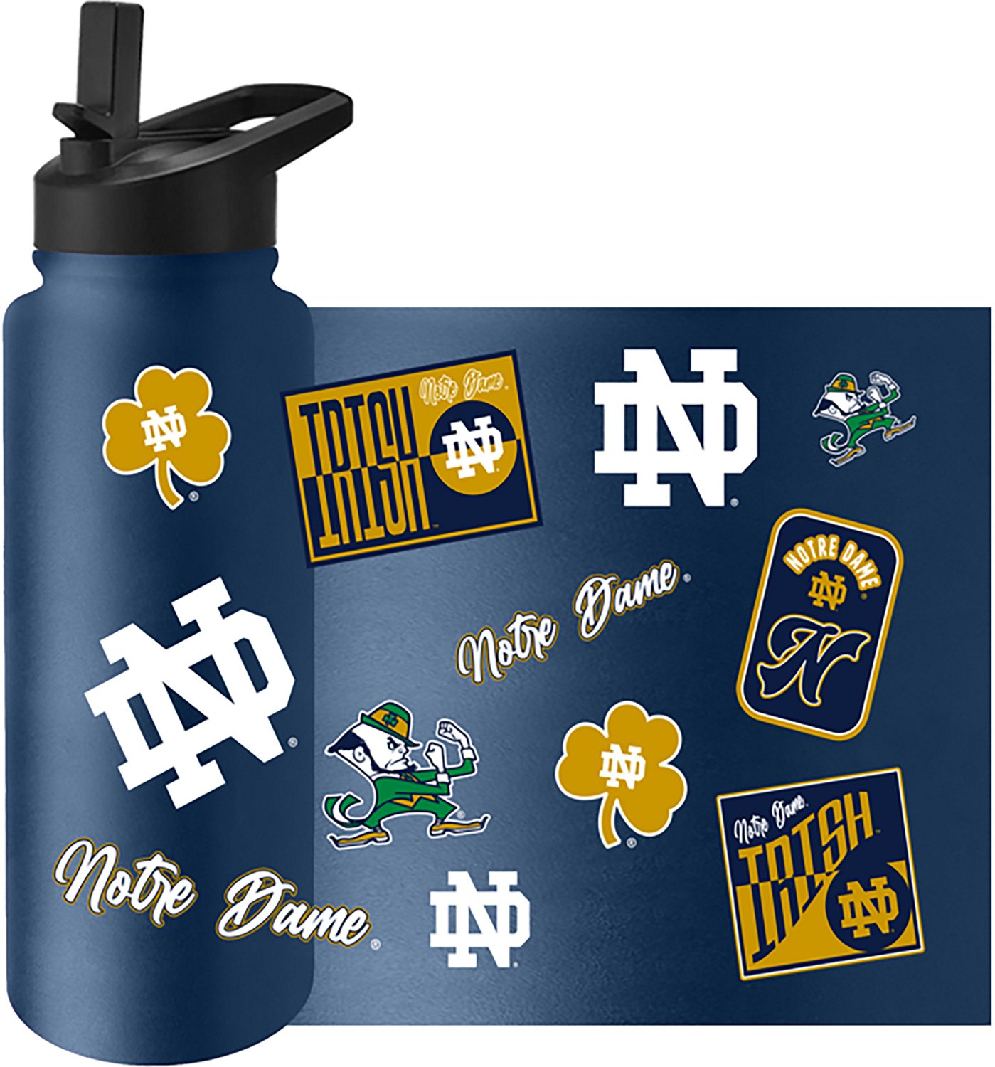 Stay hydrated on the go with the Logo Brands Notre Dame Fighting Irish Dreamweave Quencher 34 oz. Water Bottle. Its stainless steel construction enhances durability. The double-wall and vacuum insulation keeps your drink cold for hours, and its easy-carry handle offers convenient sipping while on the go. The Notre Dame Fighting Irish graphics show off your team spirit.