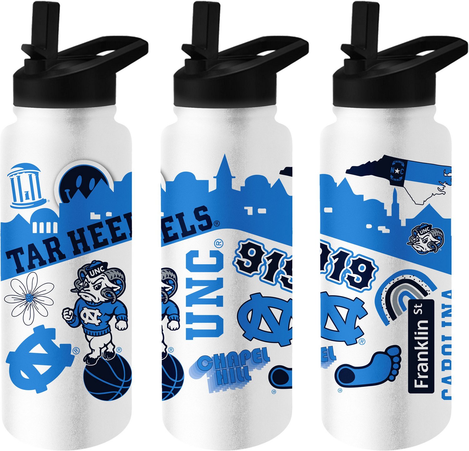 Display your love for the North Carolina Tar Heels wherever you go with the Logo Brands University of North Carolina Native Quencher 34 oz Water Bottle. This 34-ounce water bottle is made of double-wall insulated stainless steel to keep your water cold for hours. The leakproof lid features a flip-top spout with a straw for easy hydration. UNC-inspired graphics show your Tar Heels pride.