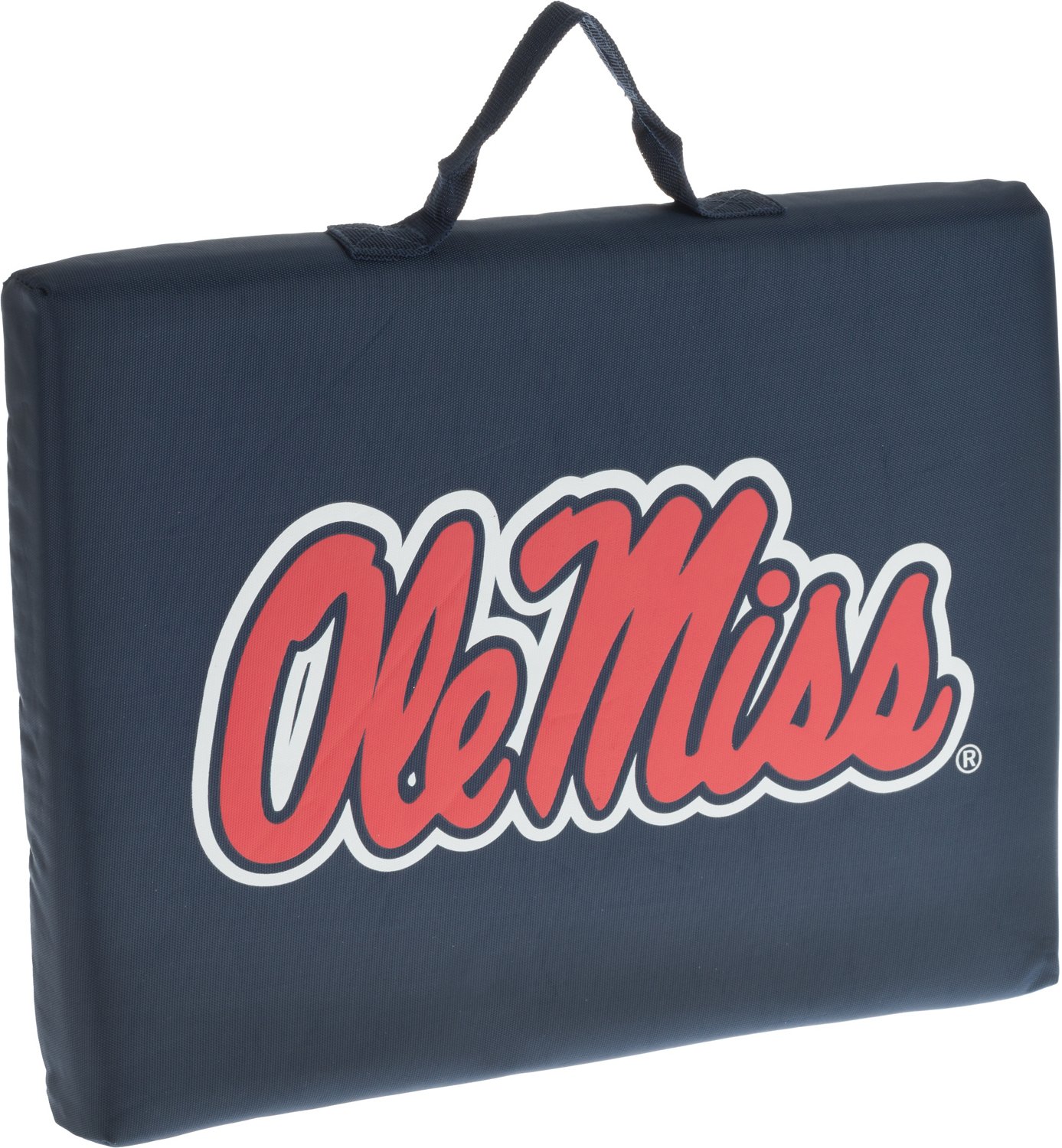 Make sure you're in a comfortable position to cheer on the Rebels from the sidelines with the Logo University of Mississippi Bleacher Cushion. Featuring a screen-printed school graphic on the front, this padded cushion offers a soft spot to rest when you're not on your feet cheering. Made with water-resistant polyester and foam for durable use, this seat features an attached handle for easy portability. Visit the Fan Shop at Academy.com to find more great Ole Miss game day accessories.