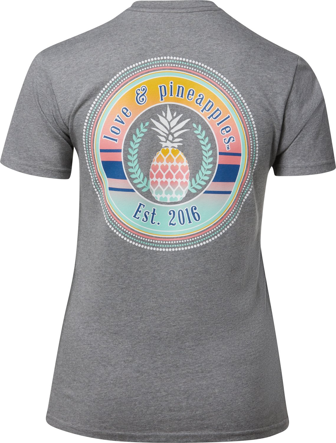 Show your casual style in the Love & Pineapples Women's Gradient Circle Logo T-shirt. This T-shirt is made from 52% preshrunk cotton and 48% polyester fabric for comfort and durability and has a gradient circle logo on the back for a stylish touch.