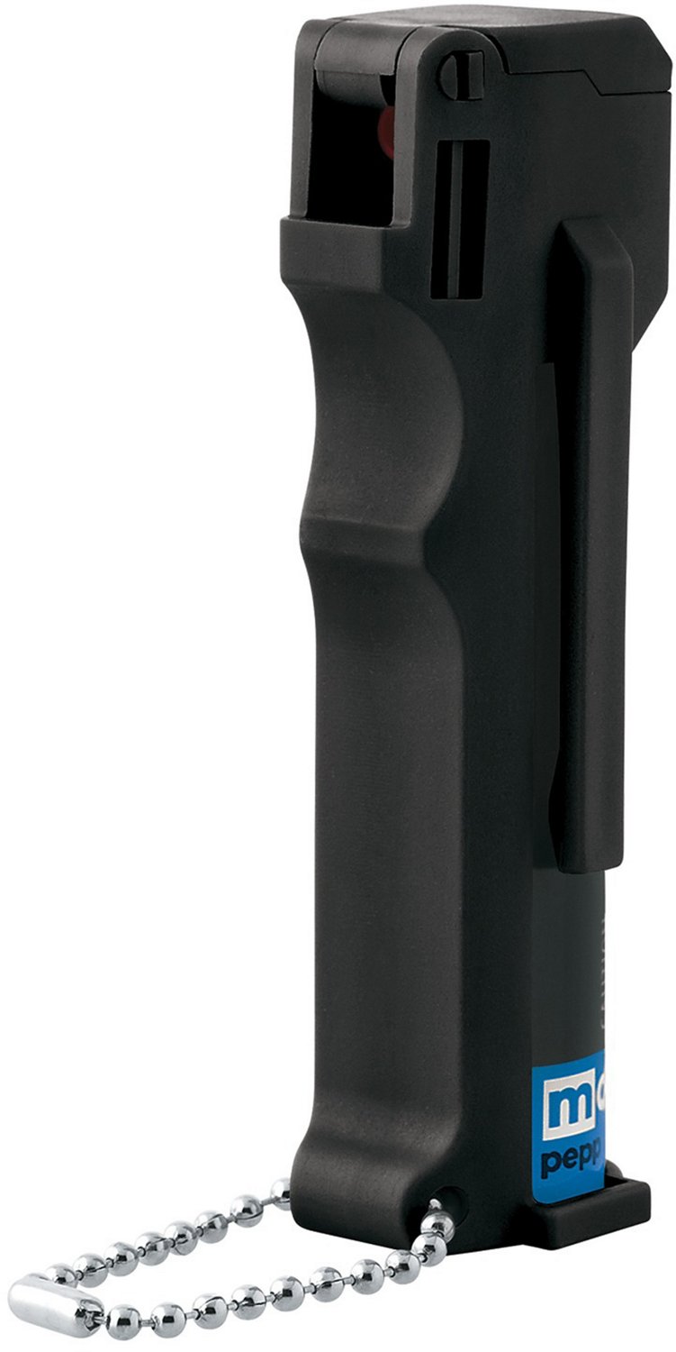 Get powerful personal protection on the go when you carry the Mace Triple Action Personal Model Pepper Spray. The 3-in-1 formulation of pepper spray, tear gas and UV detection dye helps ensure your safety and assailant identification. The canister supplies up to 20 bursts of spray with up to 12-foot ranges, and the finger-grip design promotes target accuracy. The flip top prevents accidental discharge, while the keychain promotes convenient carrying and accessibility.