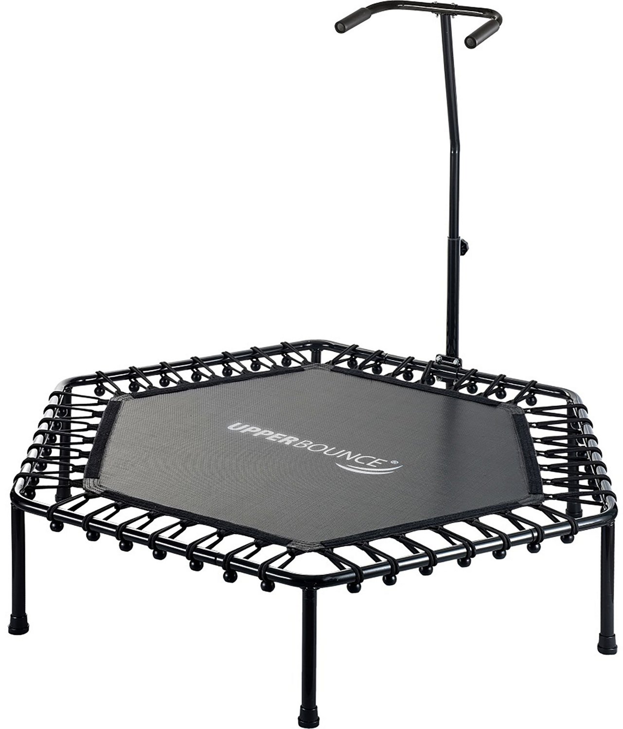 Add versatility to your workout with the Machrus Upper Bounce 50 in Mini Hexagon Trampoline with Adjustable Handrail. This mini trampoline features a unique bungee design for quiet jumping that helps you burn calories and stay in shape while having fun. The handrail helps you keep your balance and is adjustable between 39 and 45 inches. A unique design helps you get a low impact workout in as you watch tv, and the rubber-tipped legs prevent slipping and sliding and protect your floors.