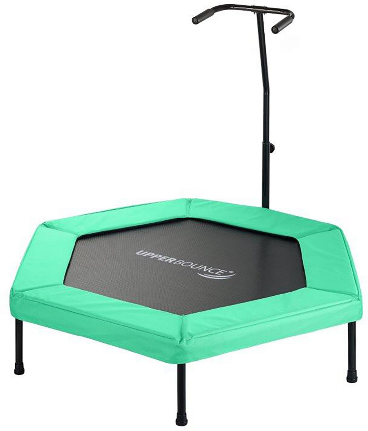 Add versatility to your workout with the Machrus Upper Bounce 50 in Mini Hexagon Trampoline with Adjustable Handrail. This mini trampoline features a unique bungee design for quiet jumping that helps you burn calories and stay in shape while having fun. The handrail helps you keep your balance and is adjustable between 39 and 45 inches. A unique design helps you get a low impact workout in as you watch tv, and the rubber-tipped legs prevent slipping and sliding and protect your floors.