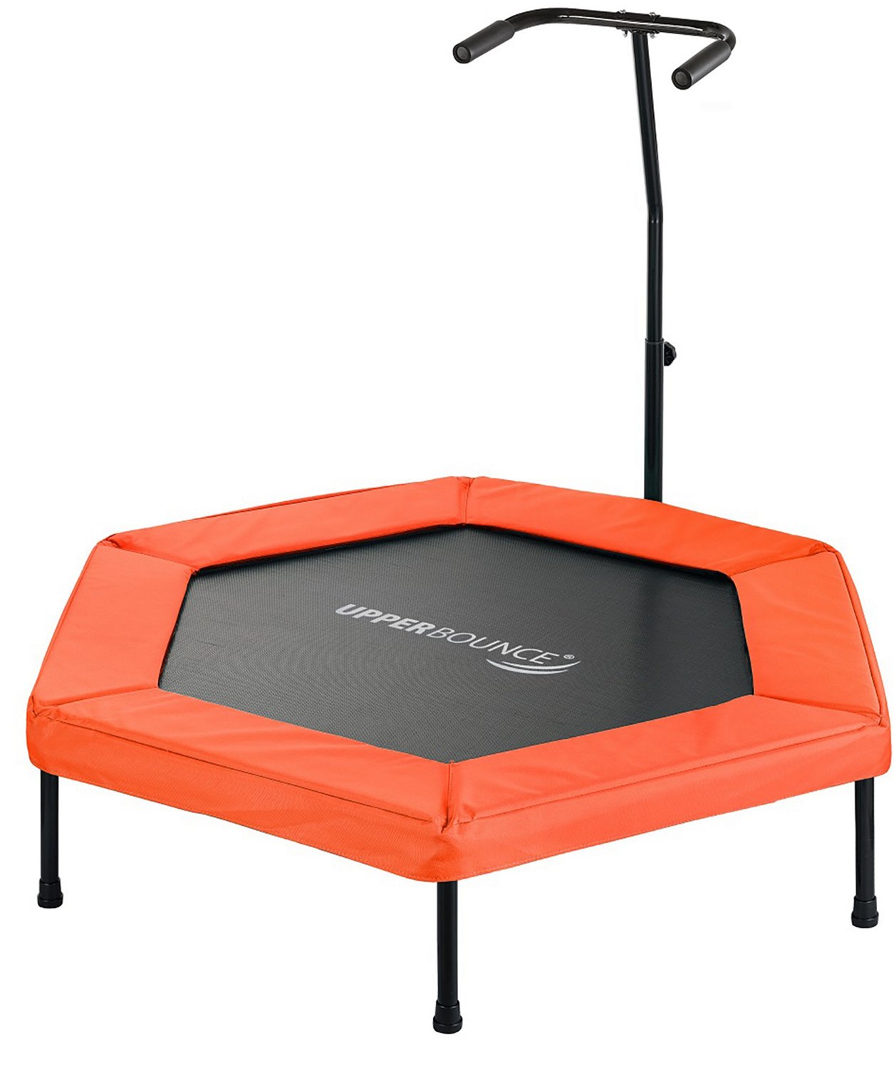 Add versatility to your workout with the Machrus Upper Bounce 50 in Mini Hexagon Trampoline with Adjustable Handrail. This mini trampoline features a unique bungee design for quiet jumping that helps you burn calories and stay in shape while having fun. The handrail helps you keep your balance and is adjustable between 39 and 45 inches. A unique design helps you get a low impact workout in as you watch tv, and the rubber-tipped legs prevent slipping and sliding and protect your floors.