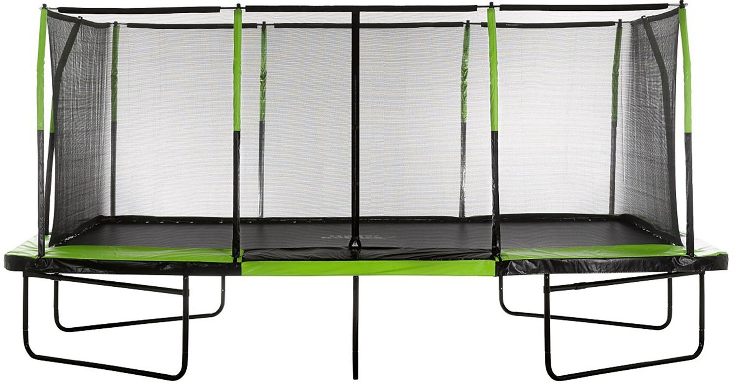 Bounce higher with the Machrus Upper Bounce Mega Gymnastics Style 10 ft x 17 ft Rectangle Trampoline. Its heavy-duty powder-coated steel frame provides stability and durability, and the UV and water-resistant polypropylene jumping mat and high-tension 7-inch springs offer flexibility and bounce for high jumps. The included enclosure has zippered access for safe and easy entry and exit and has foam-wrapped poles for added safety.