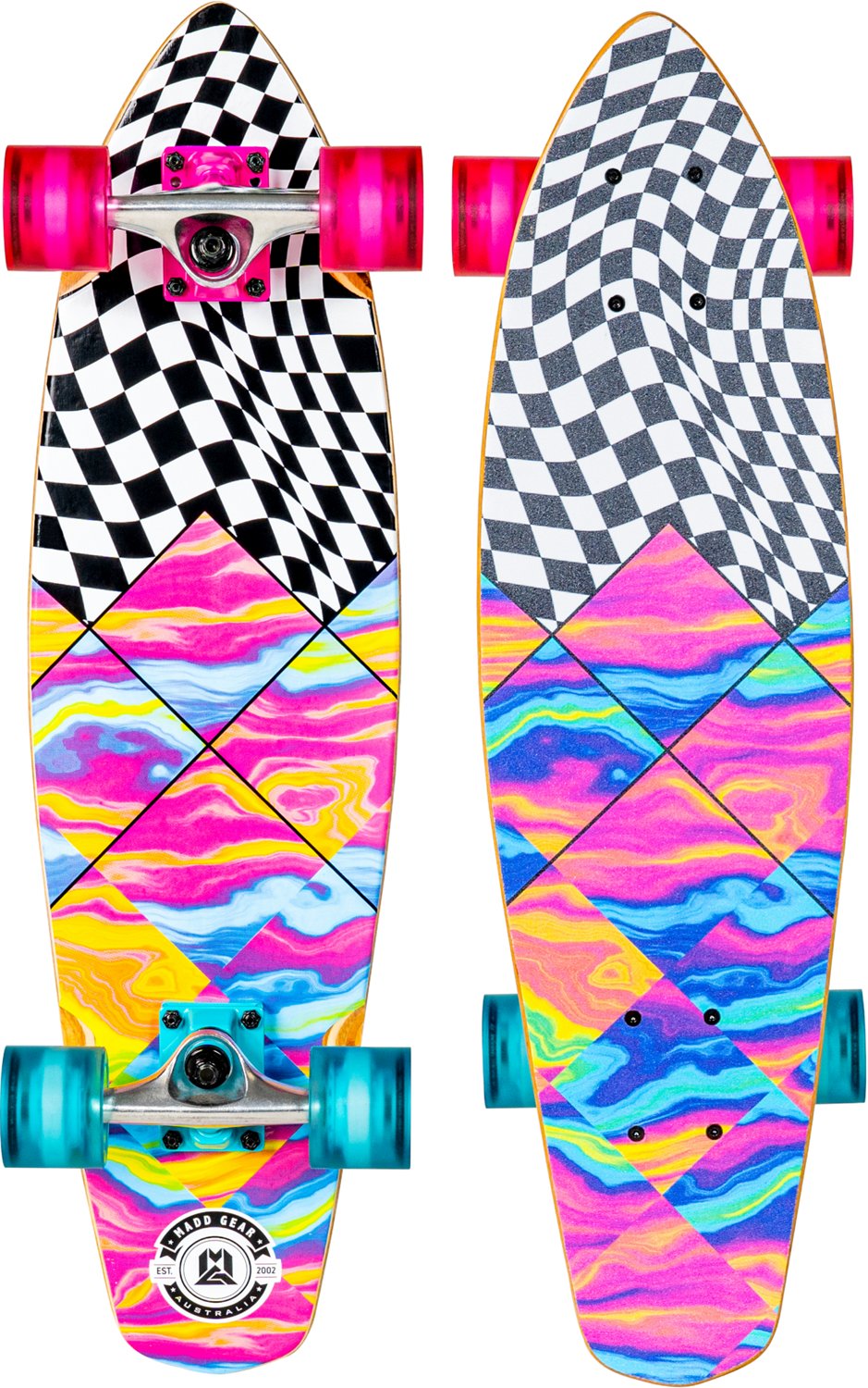 Cruise in style with the Madd Gear 28-in Cruiser Skateboard. This skateboard helps you ride smoothly along the beach or town. Made with an 8-ply maple deck for lightweight durability, this cruiser has 5-inch heavy-duty aluminum trucks, Abec-7 carbon steel bearings and 62-millimeter wheels for a smooth ride that's easy to control on bumpy surfaces.