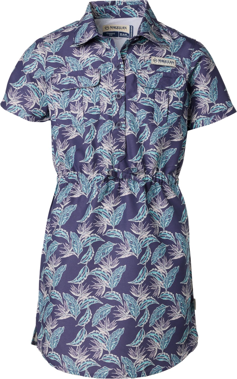 Look your best in the Magellan Girls' Caddo Lake Printed Dress. It is made of 100% polyester. The moisture wicking technology keeps you dry, and its elastic waistband allows for adjustability. The UPF 25 rating protects you from the sun.