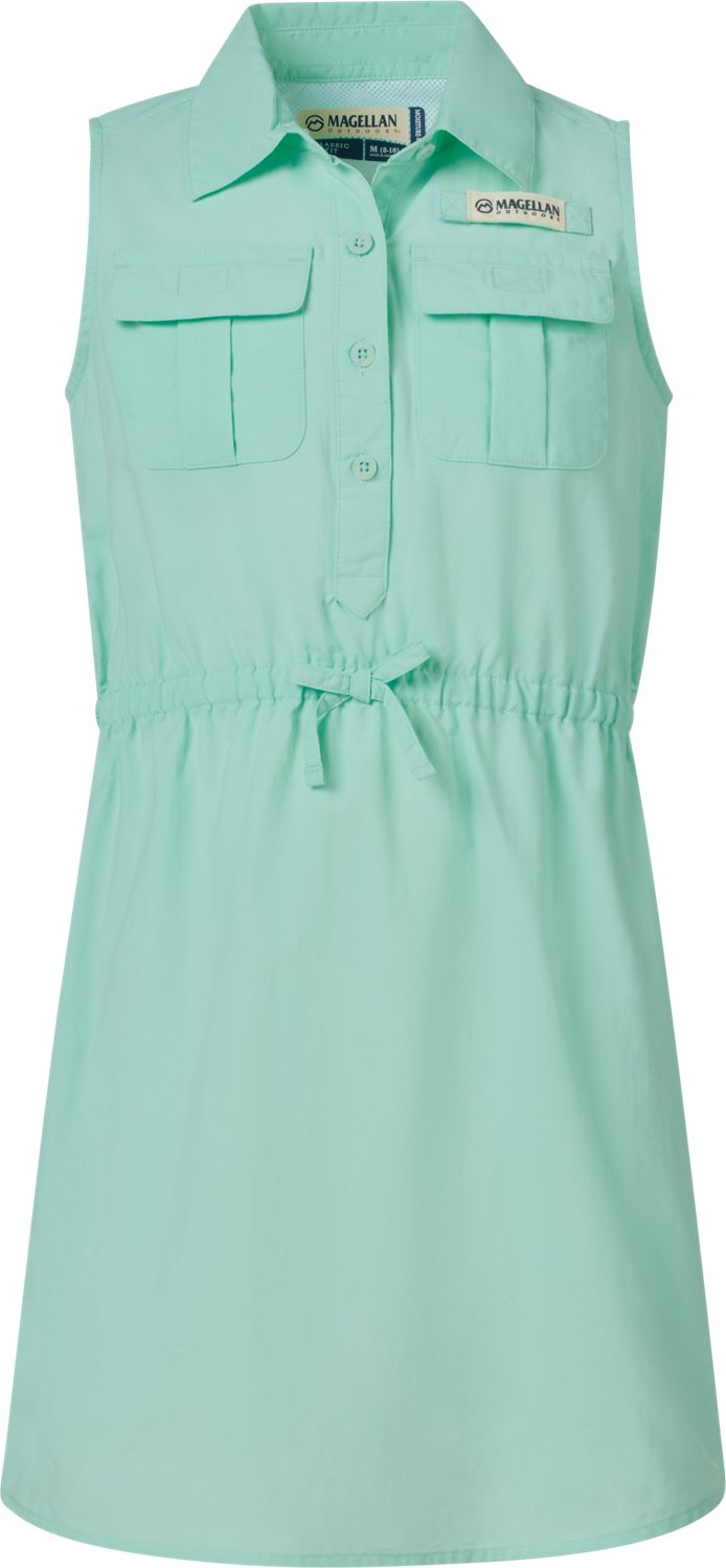 Look your best in the Magellan Girls' Laguna Madre Sleeveless Dress. Its moisture wicking technology keeps you dry. The shell is made of 100% nylon, and its lining is made of 100% recycled mesh. The UPF 30 rating protects you from the sun.