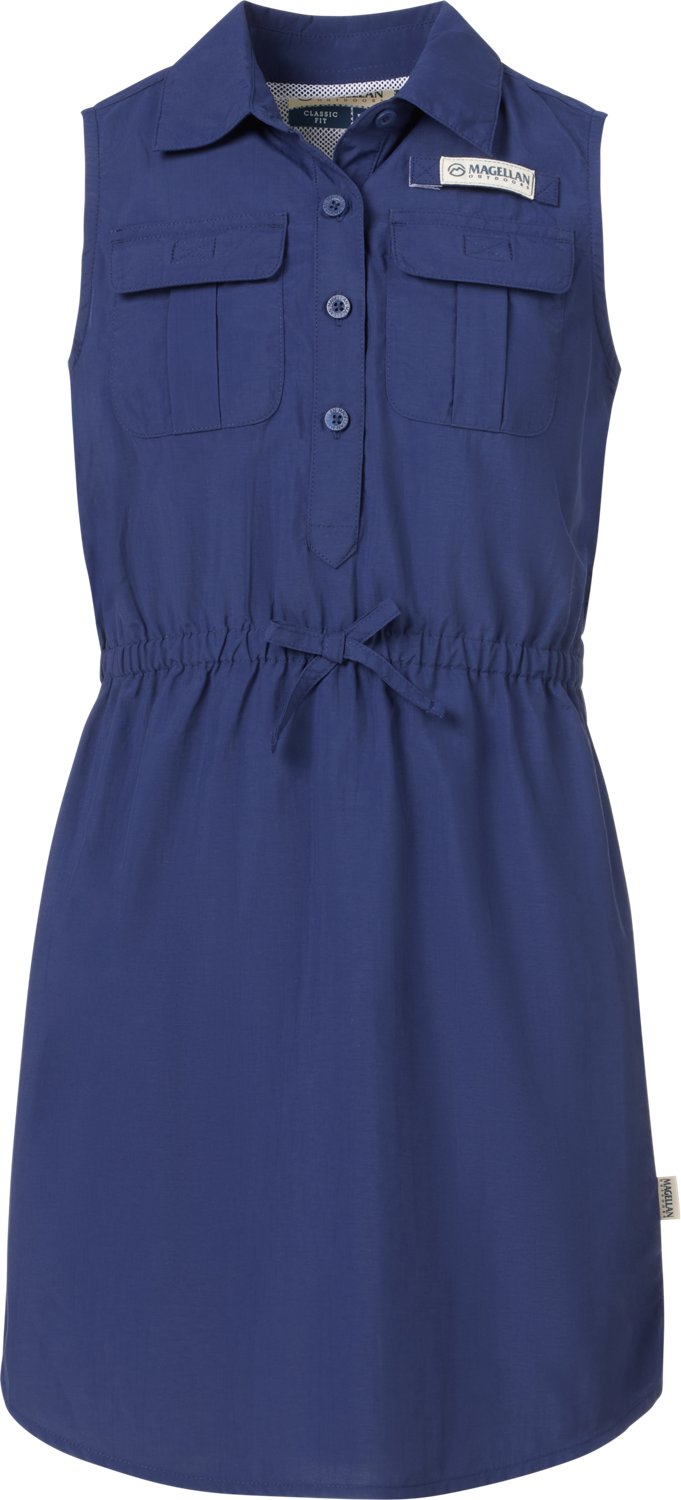 Look your best in the Magellan Girls' Laguna Madre Sleeveless Dress. Its moisture wicking technology keeps you dry. The shell is made of 100% nylon, and its lining is made of 100% recycled mesh. The UPF 30 rating protects you from the sun.