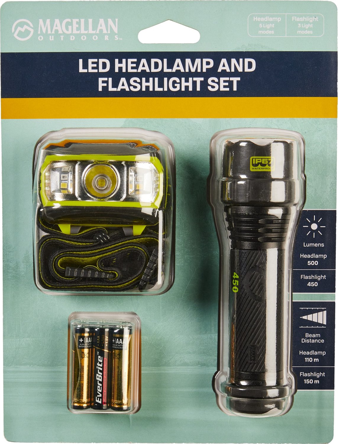 Illuminate your campsite or work zone with the Magellan Outdoors 450 L Handheld Light and 500 L Headlamp. The handheld light delivers up to 450 lumens and features 3 lighting modes: high, low and emergency strobe. The headlamp offers 500 lumens and additionally features wide beam and red light modes. Both are IPX4 waterproof and impact-resistant for lasting durability.