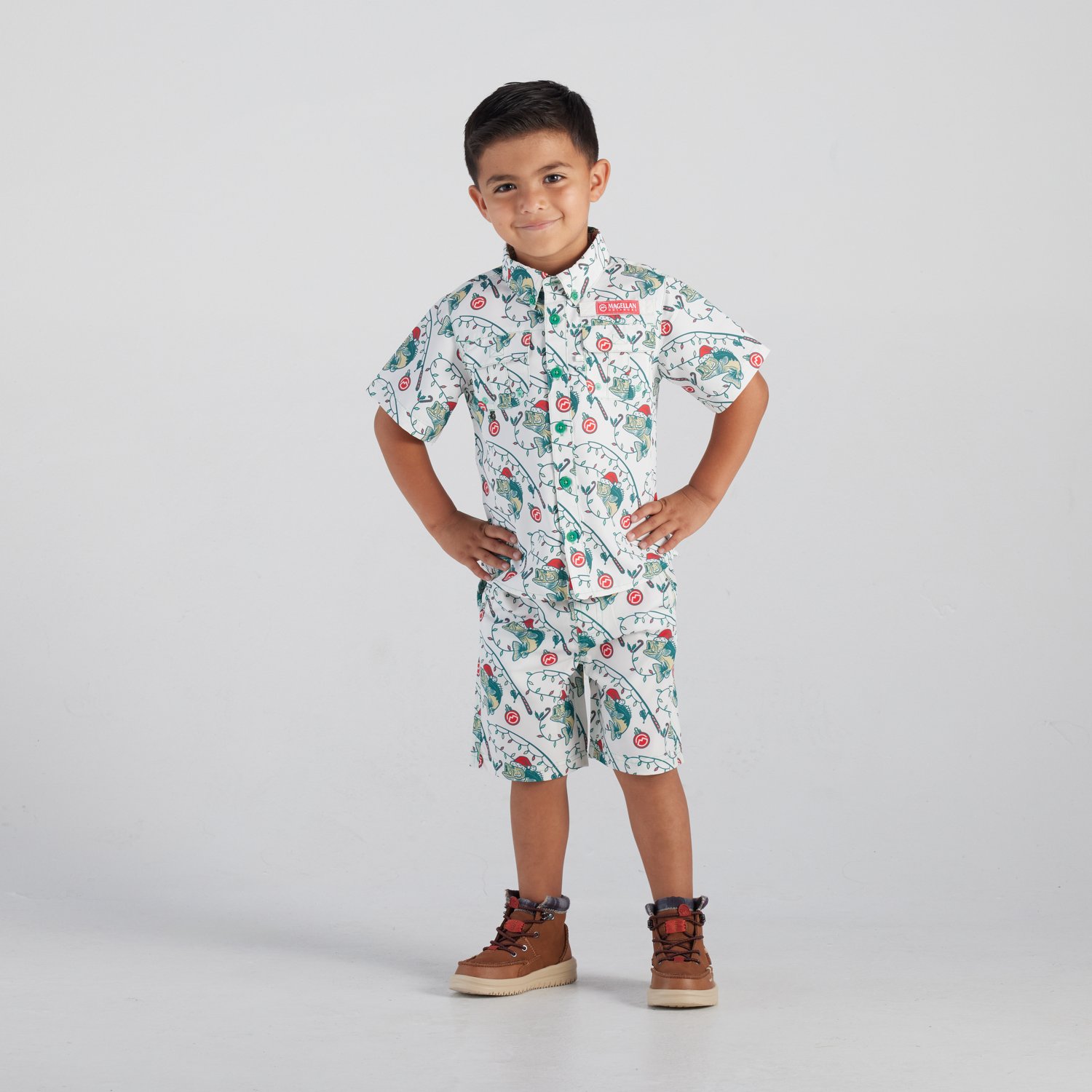 Your youngster will look great all season long in the Magellan Outdoors Boys' 4-7 Laguna Madre Holiday Catch Shirt and Short Set. This set includes a shirt and shorts made of polyester and polyester mesh to provide comfort and ventilation, and the holiday theme makes it easy to celebrate.