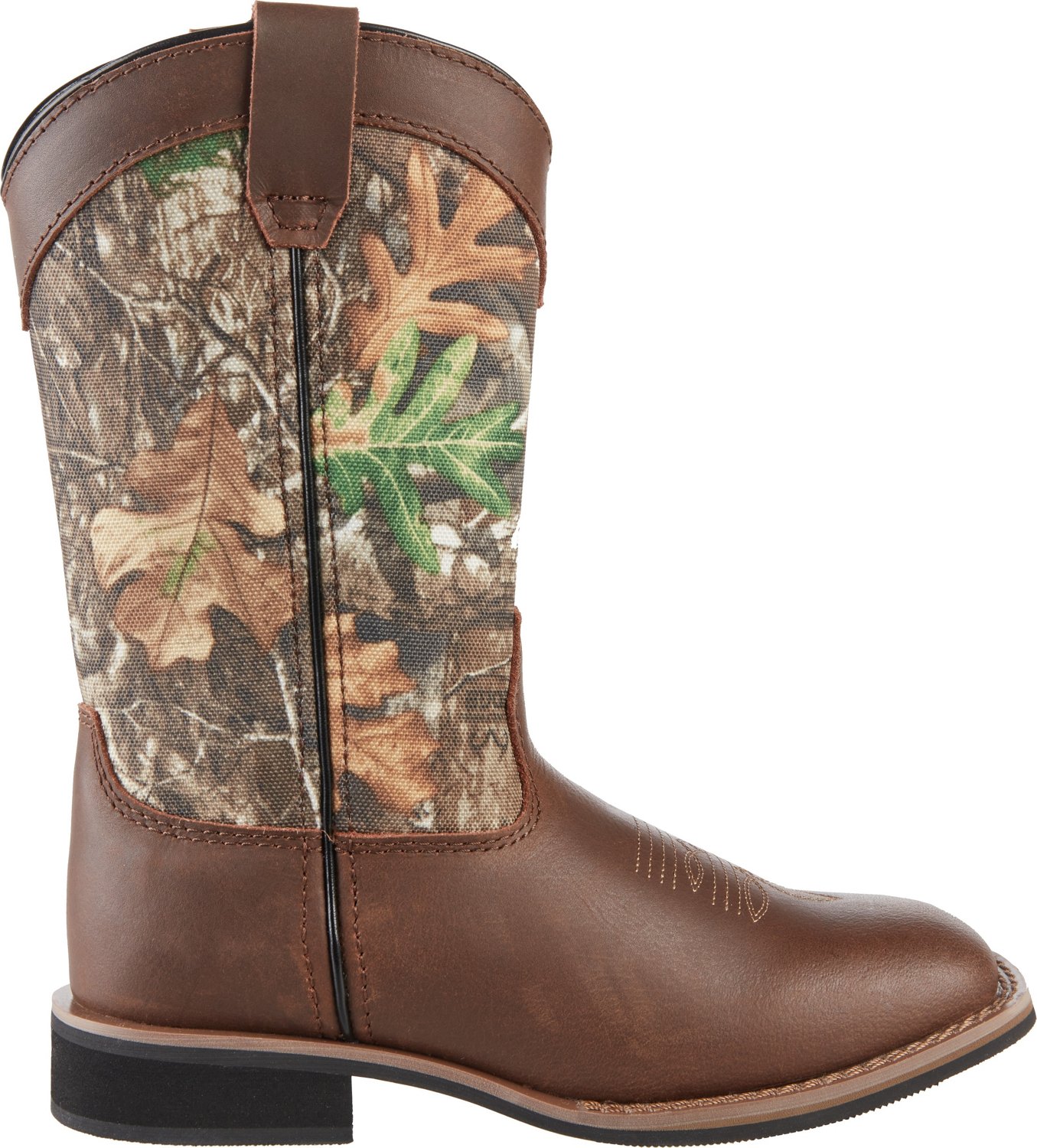 Step into the day with style underfoot when you wear the Magellan Outdoors Boys' Bandit PSGS Western Boots. The uppers combine 600D textile Real Tree Edge mino camo shafts for durability and Buffalo Crazy horse leather vamps with pull tabs for easy on and off. The die cut EVA footbeds offer comfort, while the the rubber and EVA outsoles provide traction and durability.