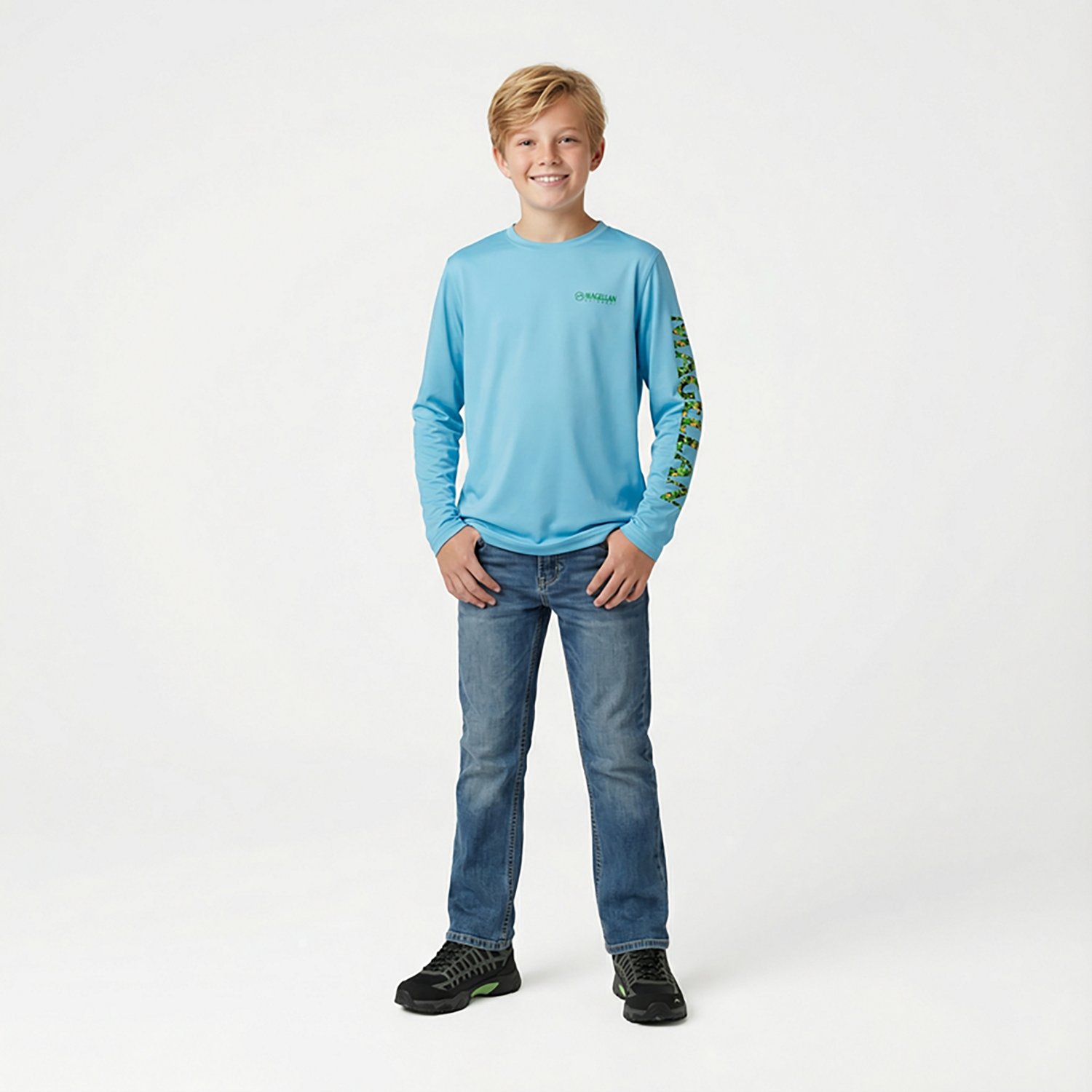 Kick back and wait for the fish to bite in the Magellan Outdoors Boys' Casting Crew Print Logo Fishing T-shirt The UPF 50+ protection helps keep your skin safe in the sun, and the 100% recycled polyester construction withstands wear and tear while feeling soft. A crewman logo print highlights a sleek appearance, and the moisture-wicking technology helps you stay cool and dry out on the water.