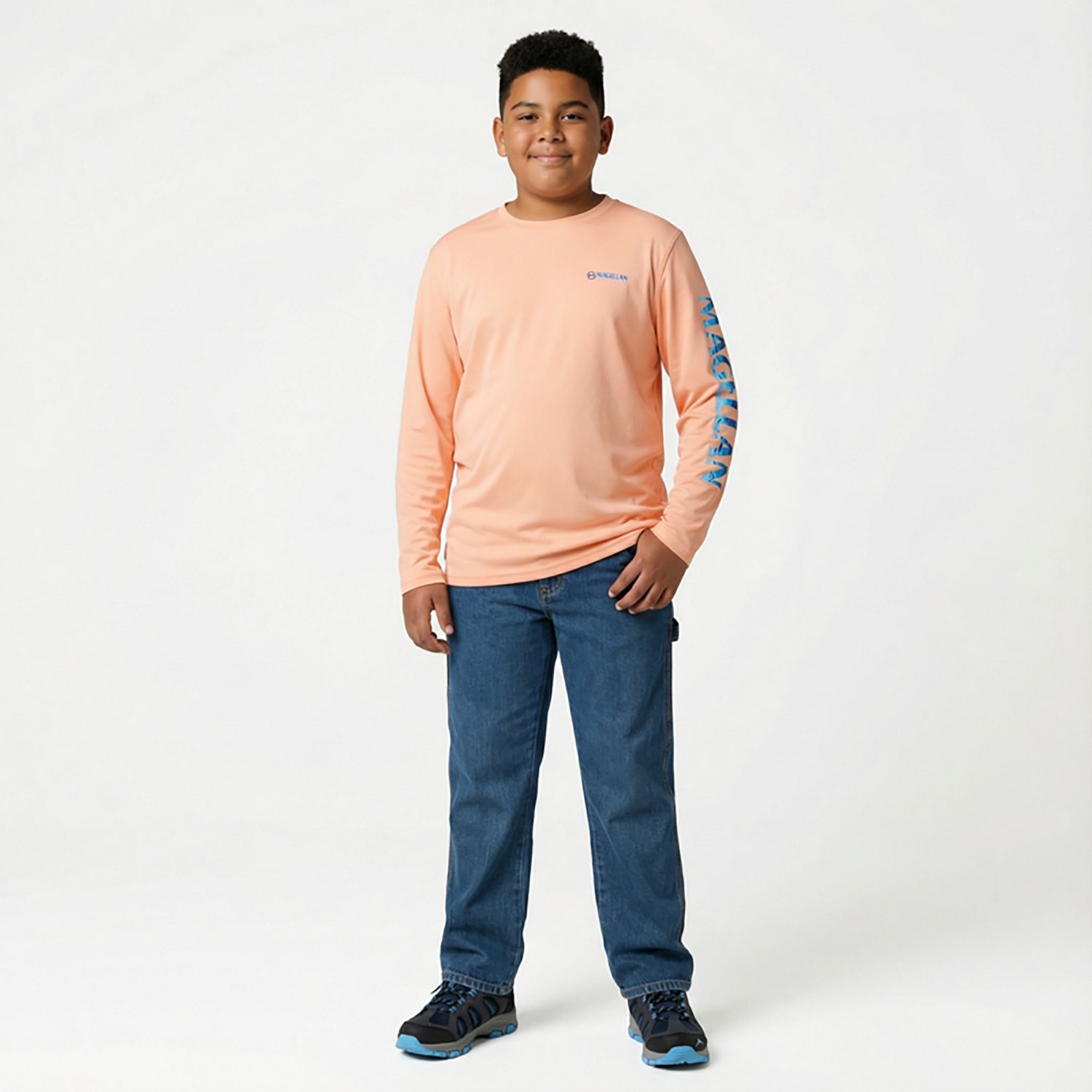 Kick back and wait for the fish to bite in the Magellan Outdoors Boys' Casting Crew Print Logo Fishing T-shirt The UPF 50+ protection helps keep your skin safe in the sun, and the 100% recycled polyester construction withstands wear and tear while feeling soft. A crewman logo print highlights a sleek appearance, and the moisture-wicking technology helps you stay cool and dry out on the water.