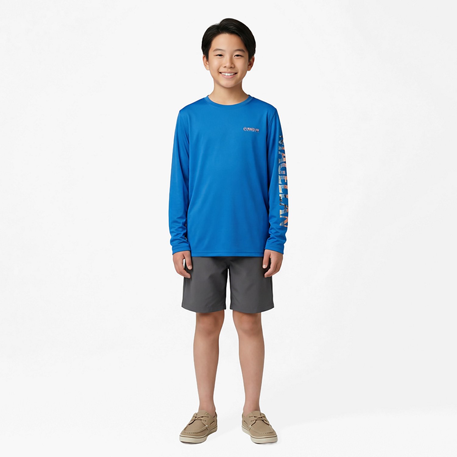 Kick back and wait for the fish to bite in the Magellan Outdoors Boys' Casting Crew Print Logo Fishing T-shirt The UPF 50+ protection helps keep your skin safe in the sun, and the 100% recycled polyester construction withstands wear and tear while feeling soft. A crewman logo print highlights a sleek appearance, and the moisture-wicking technology helps you stay cool and dry out on the water.