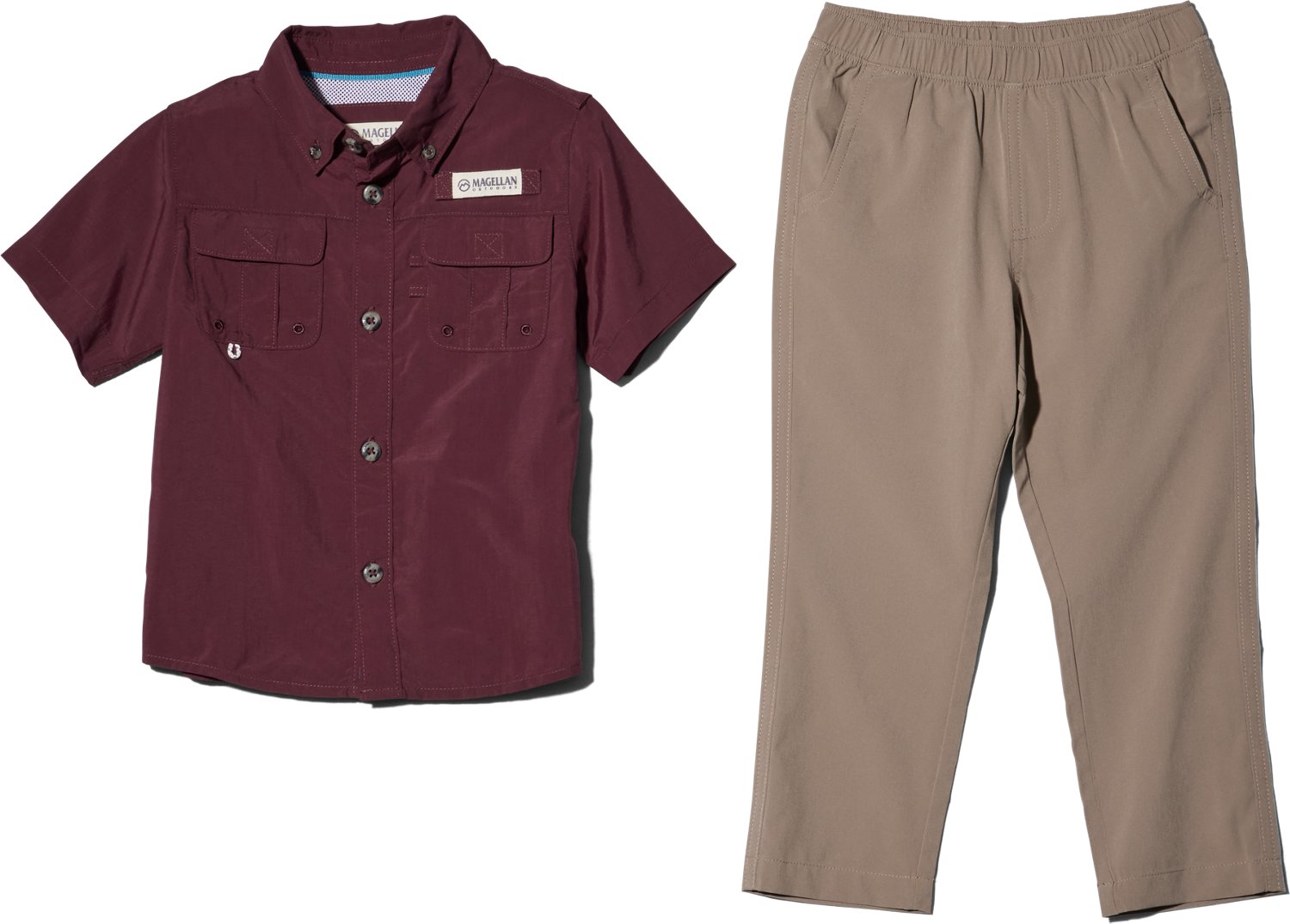 Designed for little adventurers, the Magellan Outdoors Boys' Laguna Madre Short Sleeve Pant Set combines sun protection, comfort, and durability, making it perfect for outdoor play. The lightweight, breathable shirt keeps him cool, while moisture-wicking technology ensures he stays dry during active days. The pants offer a flexible fit with a water-repellent finish to handle any adventure, big or small. With UPF 30 protection built in, this set is ready to keep up with his energy under the sun.