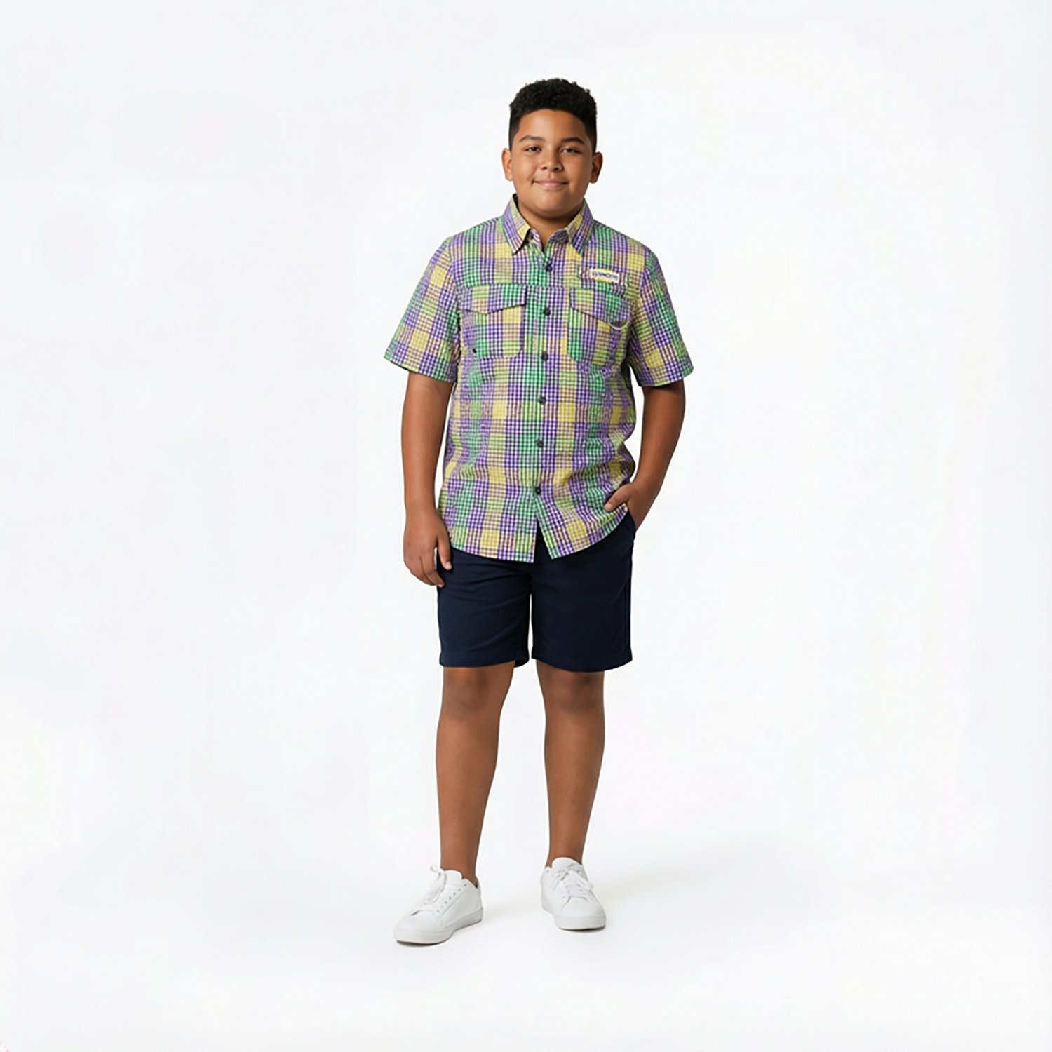 He can head outside wearing the Magellan Outdoors Boys' Mardi Gras Seersucker Gingham Short Sleeve Button-Down Shirt. This button down is made of woven polyester and nylon material for lightweight comfort. The UPF 30 protection helps guard against sun rays, while the seersucker gingham plaid print adds a stylish touch.