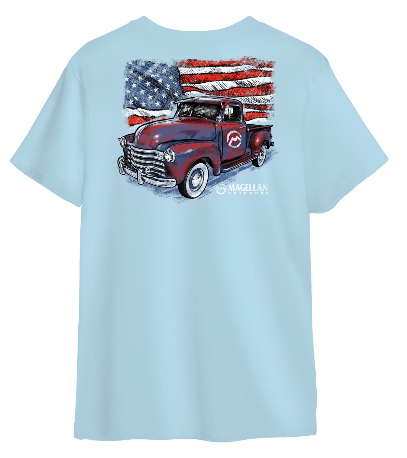Have your little on looking their best in the Magellan Outdoors Boys' Proud American Short Sleeve T-shirt. It is made of 100% cotton. The short sleeves keep them cool, and it has "Magellan Outdoors" screen printed on the left chest. The large rustic truck and an American flag is screen printed on the back.