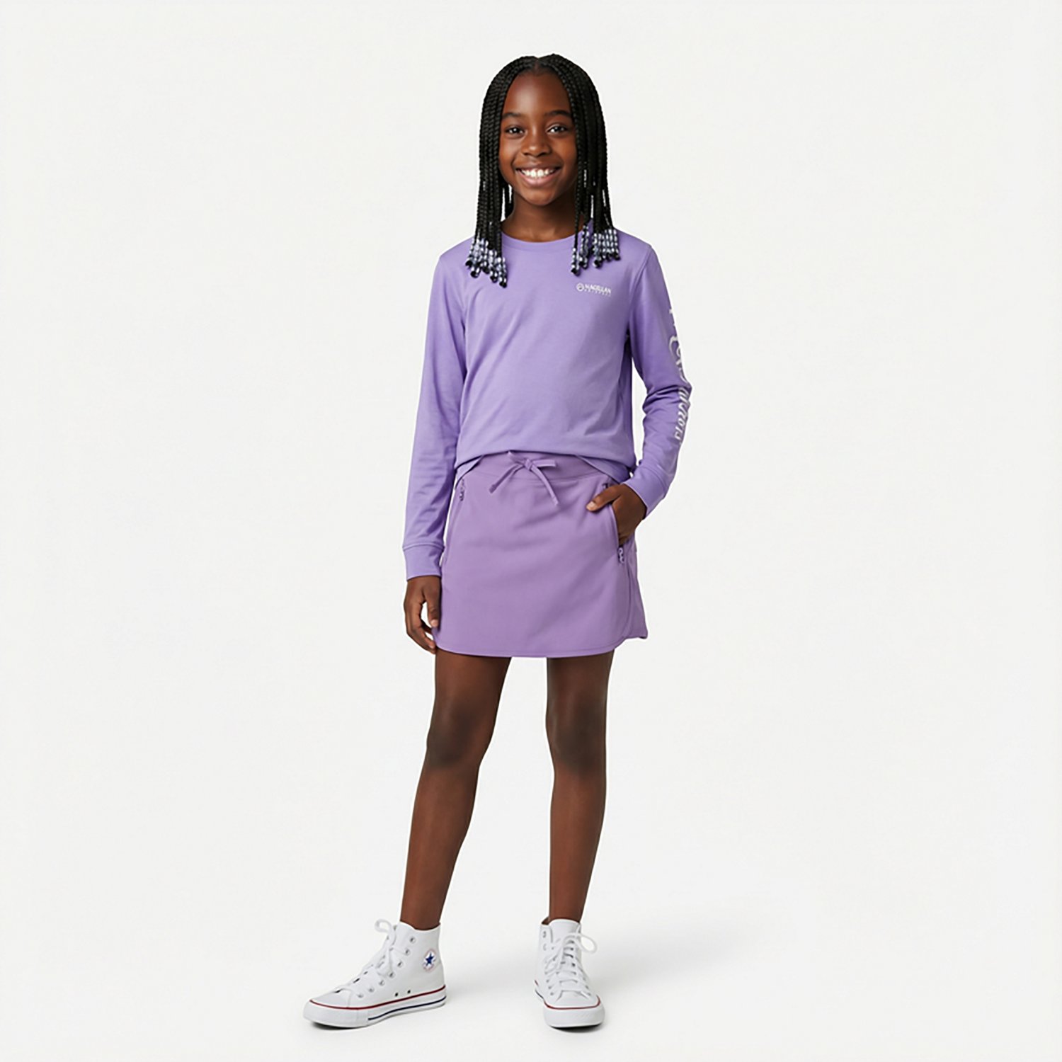 She can head out wearing the Magellan Outdoors Girls' Caddo Lake Skort. This skort is made from woven polyester and spandex material for durability. The water-repellent technology helps keep her dry, while the inner shorts add coverage.