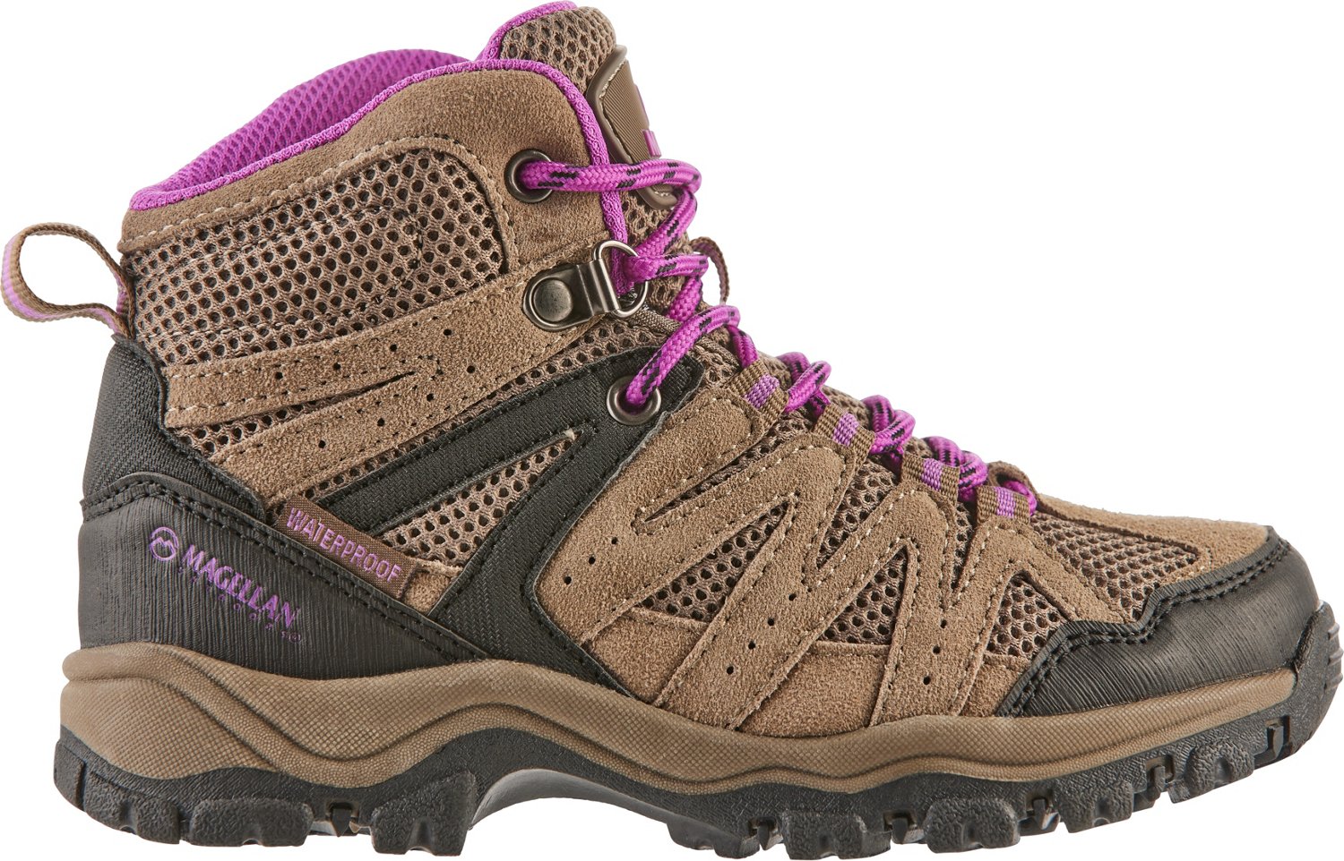 Take on the trail with comfort underfoot when you wear the Magellan Outdoors Girls' Elevation PSGS Hiker Shoes. The suede and man-made material uppers offer a soft, lightweight fit and the gusseted tongues help keep debris out, while the molded EVA midsoles provide a comfortable feel and the Cosmo Hydroguard waterproof membranes provide reliable moisture protection.