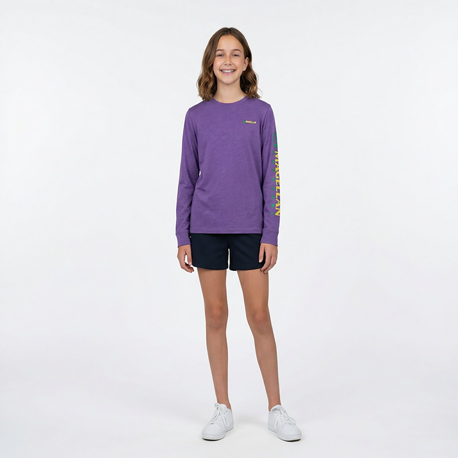From the fishing lake to the classroom, the Magellan Outdoors Girls' Grotto Falls Mardi Gras T-shirt keeps you comfortable and stylish wherever you go. This long-sleeve tee is crafted from cotton/polyester knit fabric for a soft feel and features silicone brand wordmarks on the chest and sleeve. Crew neck collar.