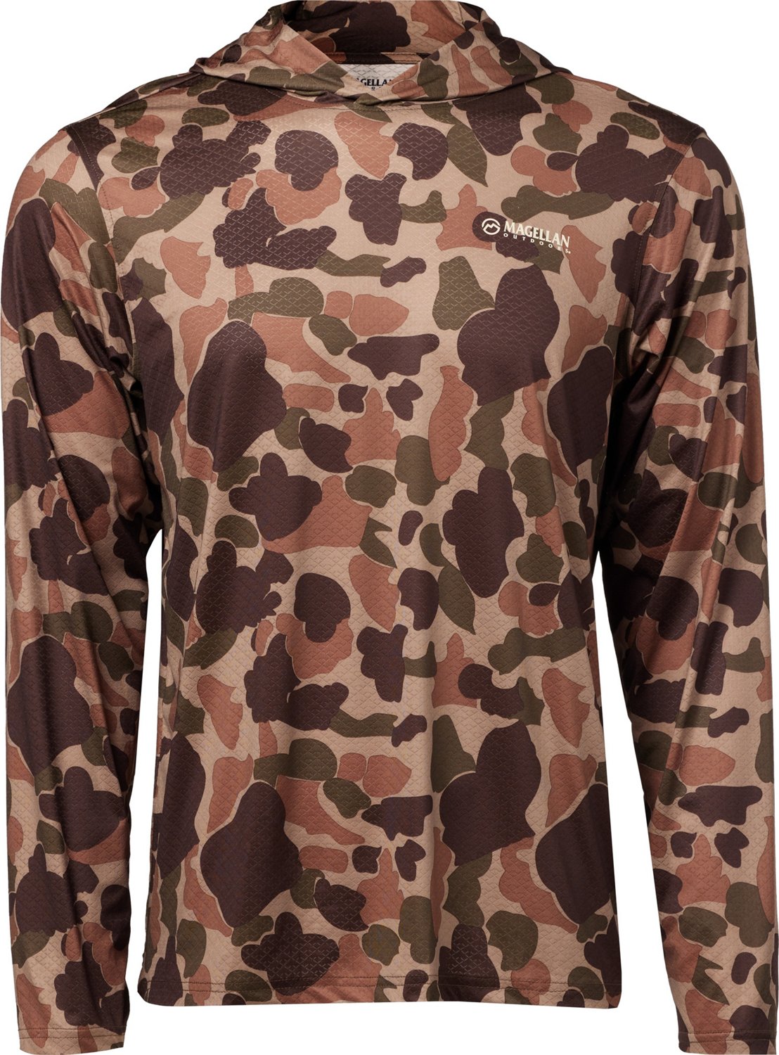 Get ready for the great outdoors with the Magellan Outdoors Hunt Gear Men's Eagle Pass Tech Mesh Long Sleeve Hooded T-shirt. Stretchy Tech Mesh fabric moves with your body and breathes freely to keep you feeling fresh. An all-over camouflage print adds a rugged look.