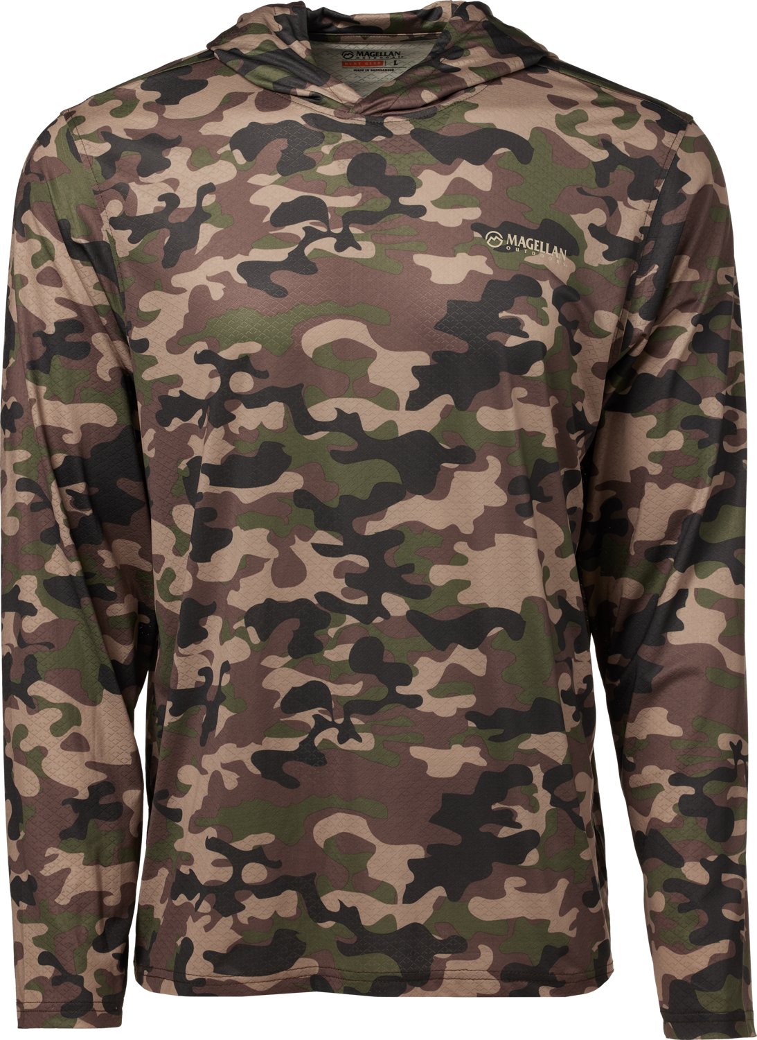 Get ready for the great outdoors with the Magellan Outdoors Hunt Gear Men's Eagle Pass Tech Mesh Long Sleeve Hooded T-shirt. Stretchy Tech Mesh fabric moves with your body and breathes freely to keep you feeling fresh. An all-over camouflage print adds a rugged look.