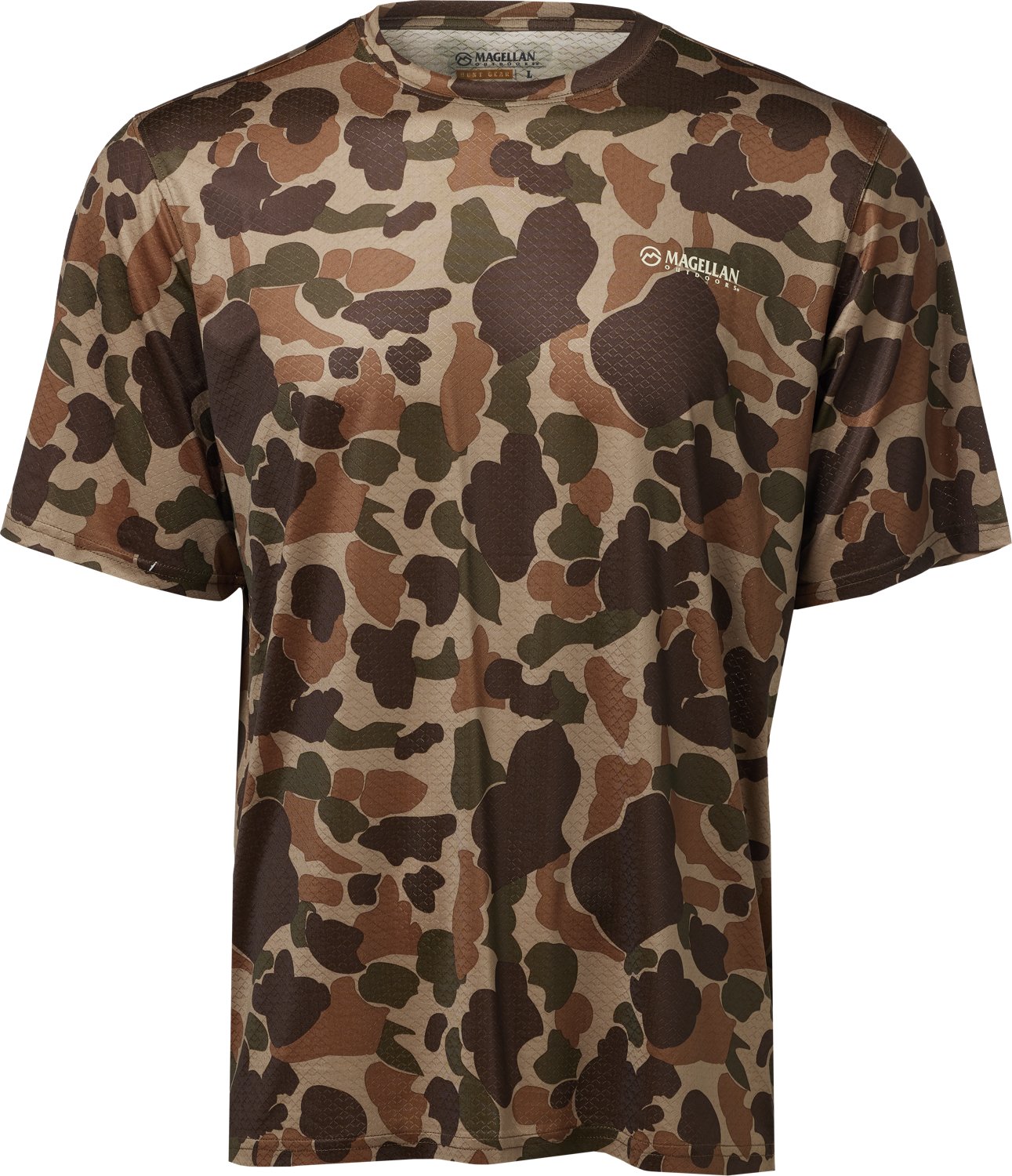 Head out the door for a day of hunting sporting the Magellan Outdoors Hunt Gear Men's Eagle Pass Tech Mesh Shirt. The UPF 30+ protection blocks harmful UV rays from your skin, and yhe moisture-wicking technology keeps you cool and dry. The polyester/spandex fabric delivers a soft feel, and the camo style and logo print helps you stay hidden in your surroundings.
