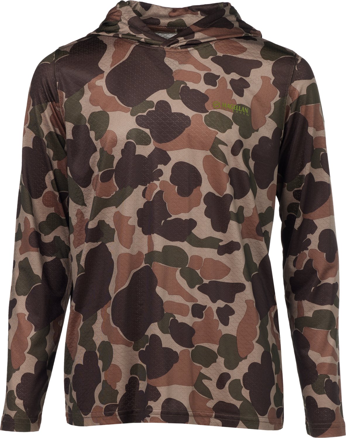 Head out for a day of hunting sporting the Magellan Outdoors Hunt Gear Youth Eagle Pass Tech Mesh Hooded Long Sleeve Shirt. The UPF 30+ protection blocks harmful UV rays from your skin, and the moisture-wicking technology keeps you cool and dry. The polyester/spandex fabric delivers a soft feel, and the camo style and logo print helps you stay hidden in your surroundings.