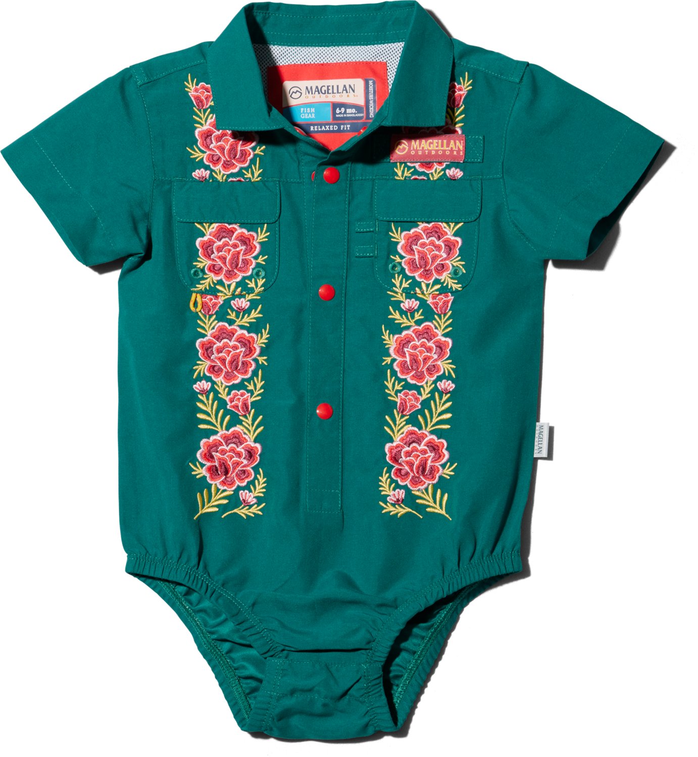 Keep him cool and comfortable with the Magellan Outdoors Infant Boys' Laguna Madre Flores Onesie. The polyester peached poplin fabric provides a comfortable feel, while moisture wicking technology helps keep him cool. UPF 25 sun protection shields against harmful UV rays, and polyester mesh cape lining offers breathability.