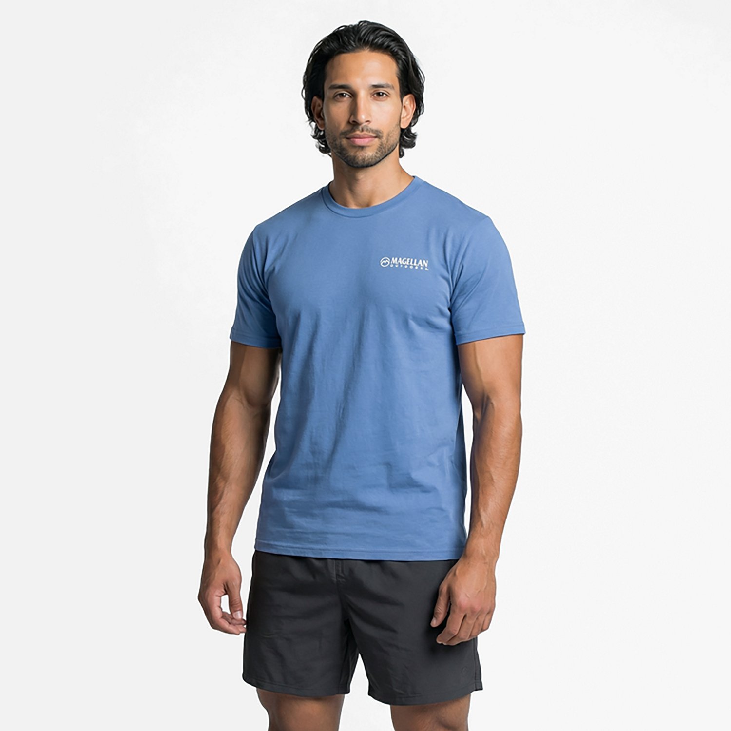 Show off your sporty side wearing this Magellan Outdoors Men’s Snowboard T-Shirt. It’s crafted from a mix of cotton and polyester for comfort and durability, and the screen-printed snowboard scene on the back adds a pop of style.