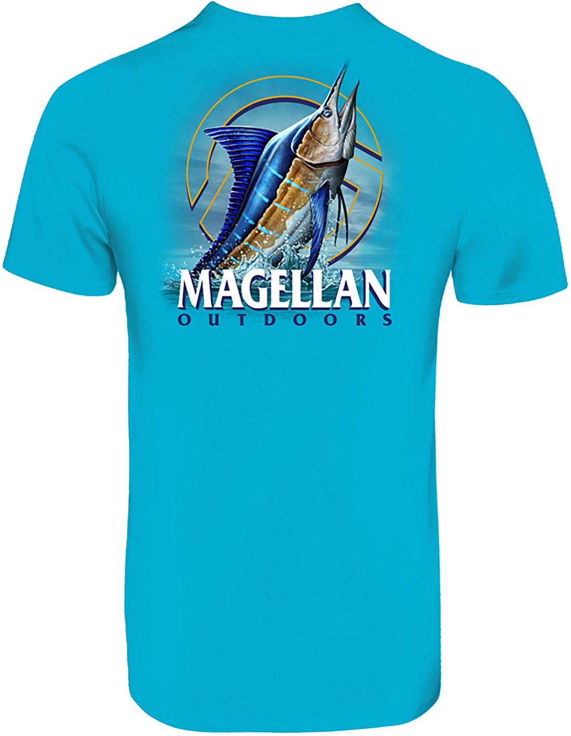 Look your best when you wear the Magellan Outdoors Men's Aerial Short Sleeve T-shirt. It is made of 100% cotton. The short sleeves keep you cool, and its crew neckline creates a casual look. The large graphic on the back adds a fun touch.