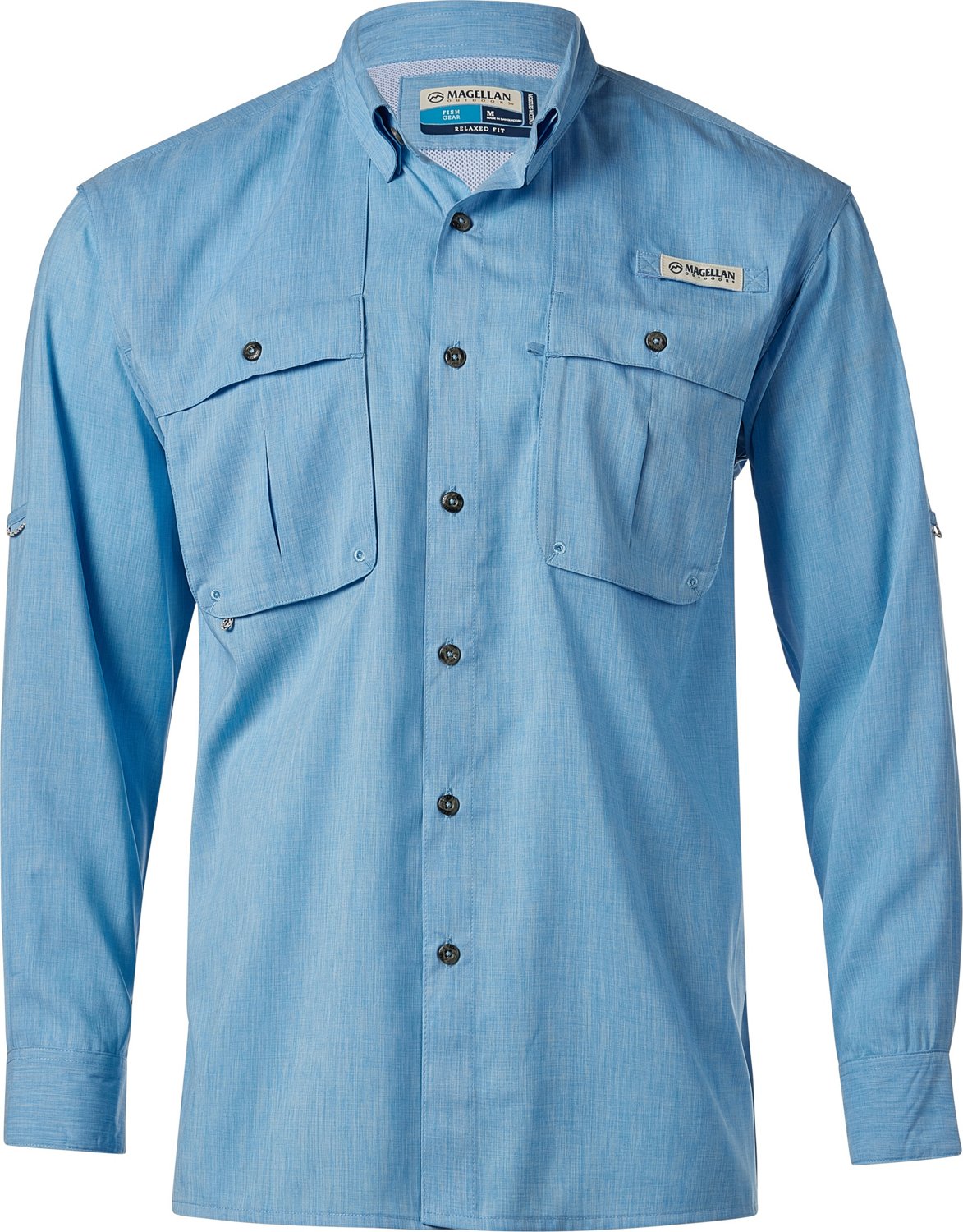 Spend your next fishing expedition in comfort with the Magellan Outdoors Men's Aransas Pass Heather Long Sleeve Fishing Shirt, which is made of 100% polyester for lightweight softness. Moisture-wicking fabric technology helps keep you comfortable on the water, while UPF 30 offers protection while out in the sun. Polyester lining. 2-pocket design.