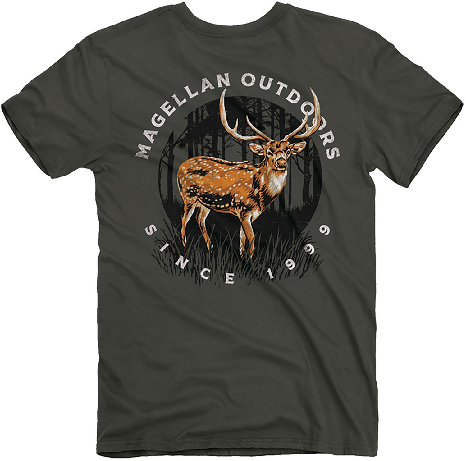 Put your stylish side on display when you wear the Magellan Outdoors Men's Axis Buck T-shirt. The 100% cotton construction provides a soft, comfortable feel, while the screen-printed graphic design adds an eye-catching appearance.