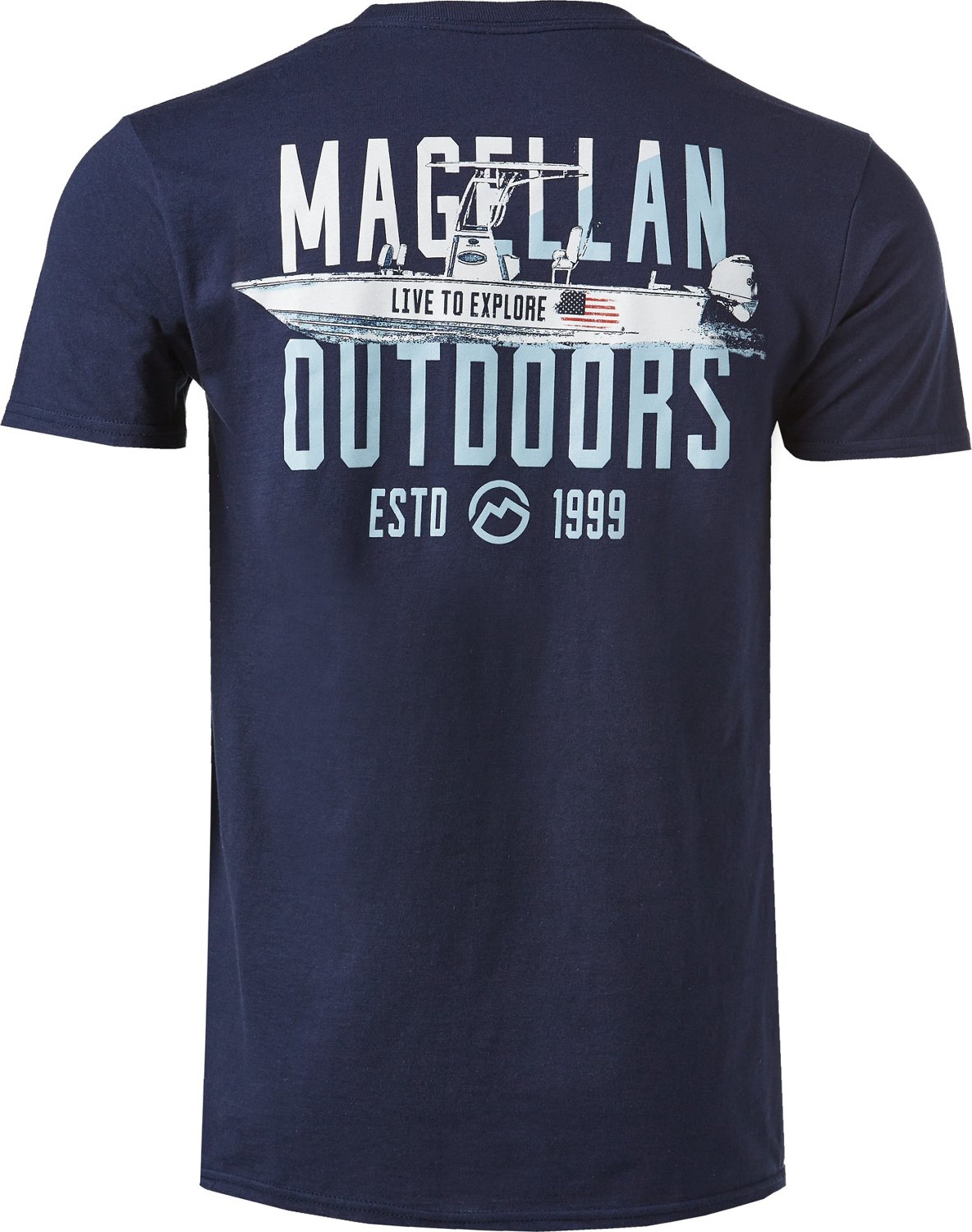 Head out for your next fishing trip in the Magellan Outdoors™ Men's Bold Fishing Boat Short-Sleeve Graphic T-shirt. The shirt is made with 100% cotton to keep you comfortable as you reel in a brag-worthy catch. On the back, a fishing boat scene announces your love of fishing loud and clear.