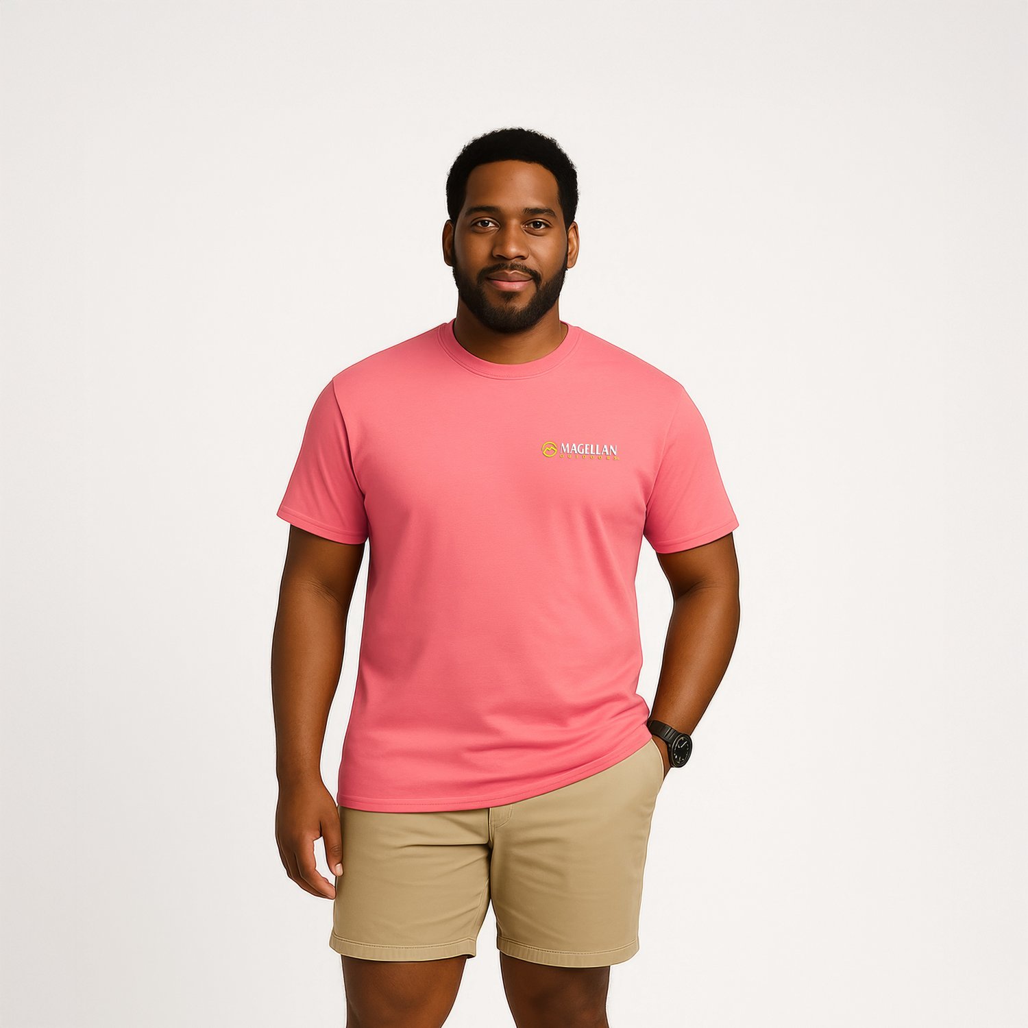 Show off your sense of style when you wear the Magellan Outdoors Men's Brand Marlin T-shirt. The 100% cotton construction provides a soft, comfortable feel all day long, and the screen-printed graphics on the left chest and back deliver an eye-catching appearance.