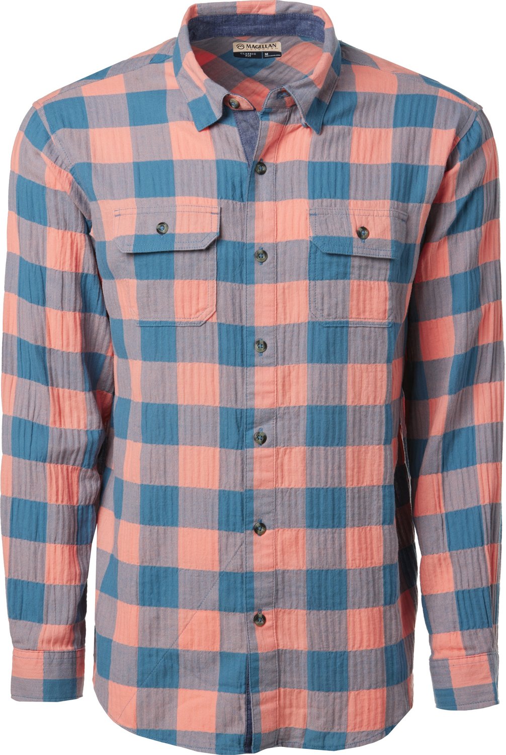 Relax by the campfire in style with the Magellan Outdoors Men's Campfire Crushed Herringbone Plaid Long Sleeve Shirt. This rustic button down shirt features a folded collar, button cuffs and timeless plaid print. The cotton-spandex blend feels soft against your skin and stretches to keep you mobile.