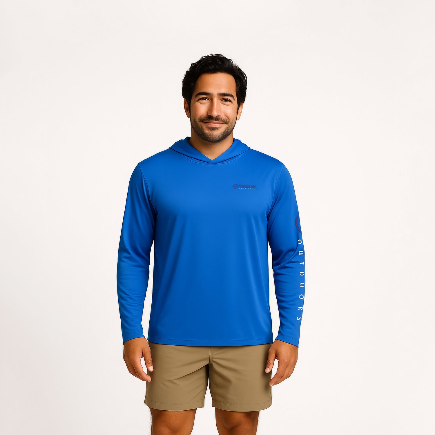 Pack the Magellan Outdoors Men's Casting Crew Long Sleeve Hoodie for your fishing trip. Made of 100% recycled polyester interlock, this shirt features moisture-wicking technology for dry, comfortable wear. Built-in UPF 50 helps protect your skin from harsh sun rays. Magellan Outdoors graphics are displayed on the chest and down the sleeve. Attached hood.