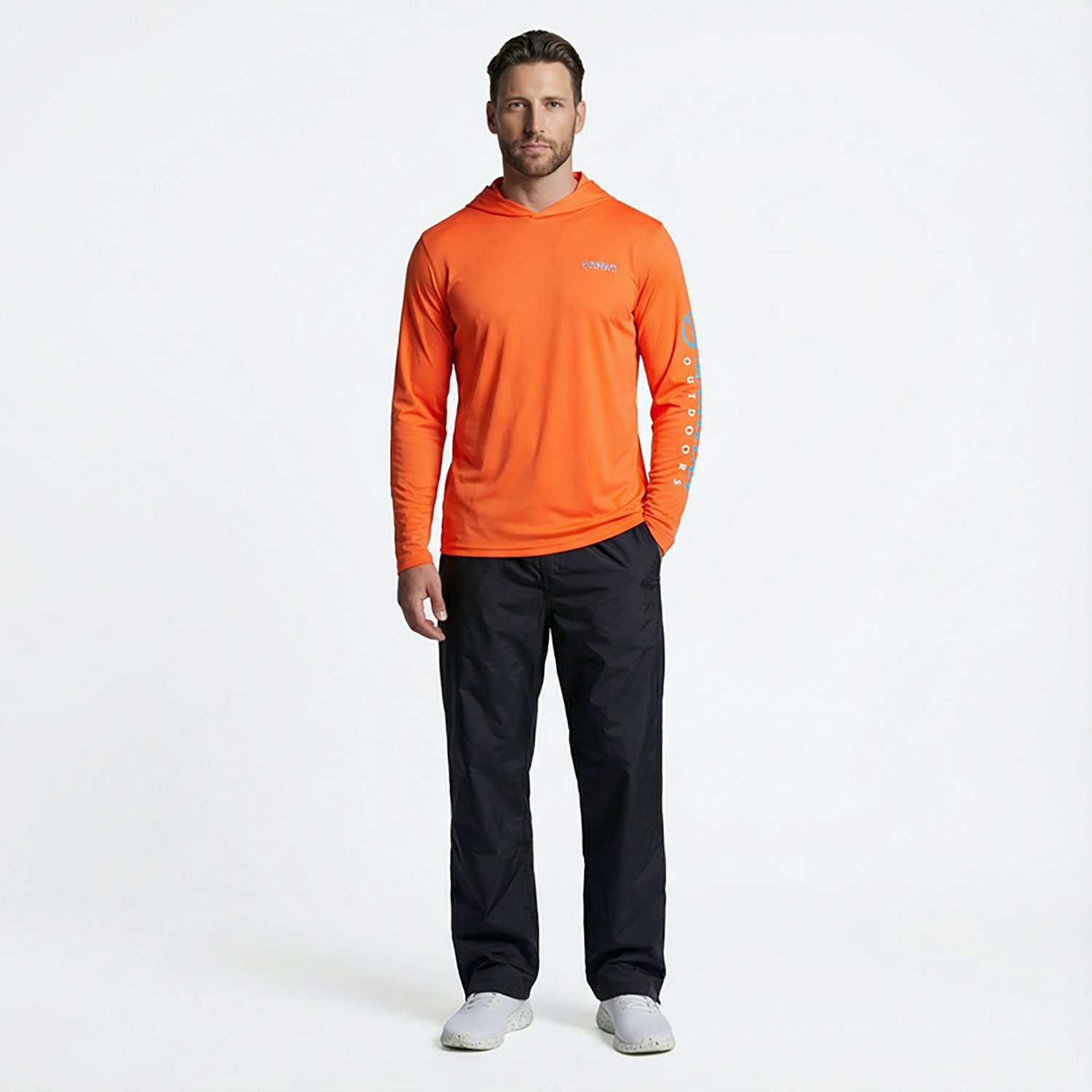 Pack the Magellan Outdoors Men's Casting Crew Long Sleeve Hoodie for your fishing trip. Made of 100% recycled polyester interlock, this shirt features moisture-wicking technology for dry, comfortable wear. Built-in UPF 50 helps protect your skin from harsh sun rays. Magellan Outdoors graphics are displayed on the chest and down the sleeve. Attached hood.