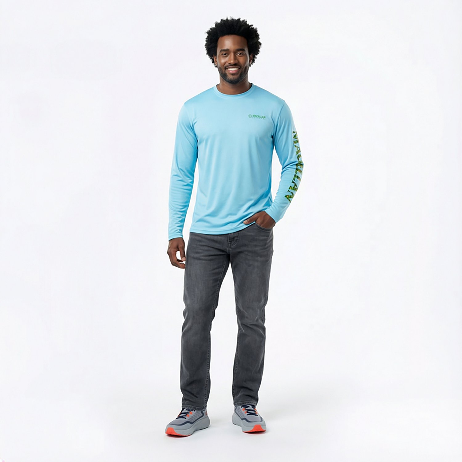 Head outside on spring days in the Magellan Outdoors Men's Casting Crew Long Sleeve T-shirt. This T-shirt is made of 100% recycled polyester interlock for durability. The UPF 50 protection helps protect against harmful sun rays.