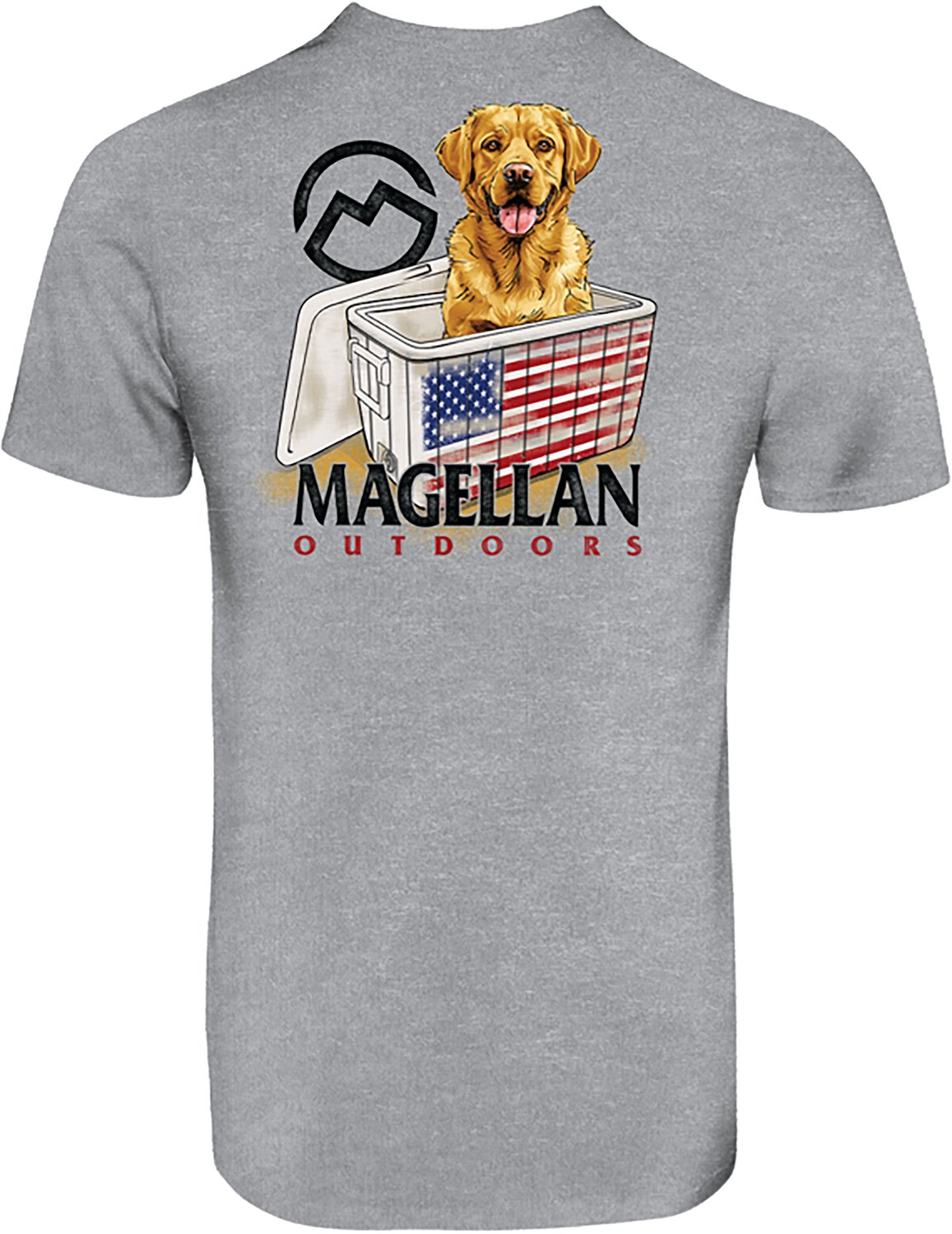 Look your best in the Magellan Outdoors Men's Cool USA Short Sleeve Graphic T-shirt. It is made of 100% cotton. The short sleeves keep you cool, and its front chest is decorated with the Magellan Outdoors logo. The back has a dog in a red, white, and blue cooler screen printed on.