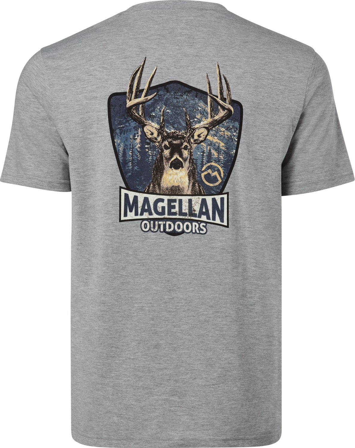 The Magellan Outdoors Men’s Deer Emblem T-shirt offers a great look and feel. This shirt is made from 55% cotton and 45% polyester fabric that delivers durability and comfort, and it also has a logo graphic printed on the chest and a graphic design on the back for a stylish look.
