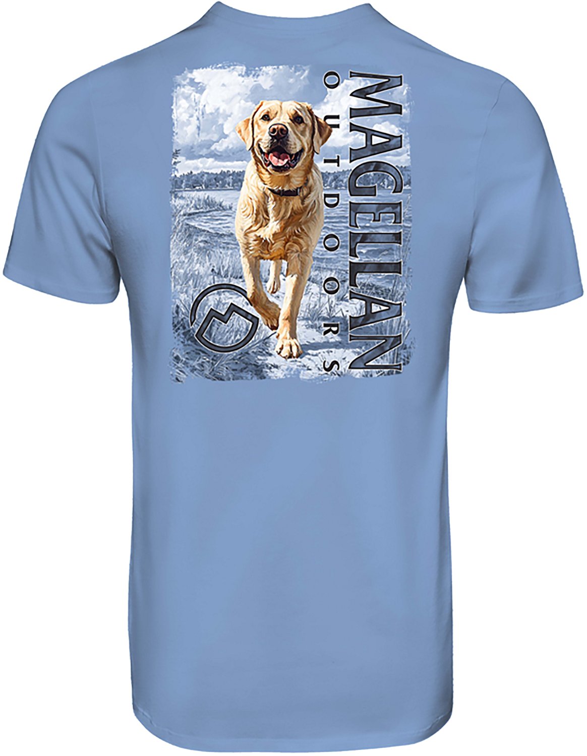 Look your best when you wear the Magellan Outdoors Men's Fetch Short Sleeve T-shirt. It is made of 100% cotton. The short sleeves keep you cool, and its crew neckline creates a casual look. The large screen printed graphic on the back adds a fun touch.