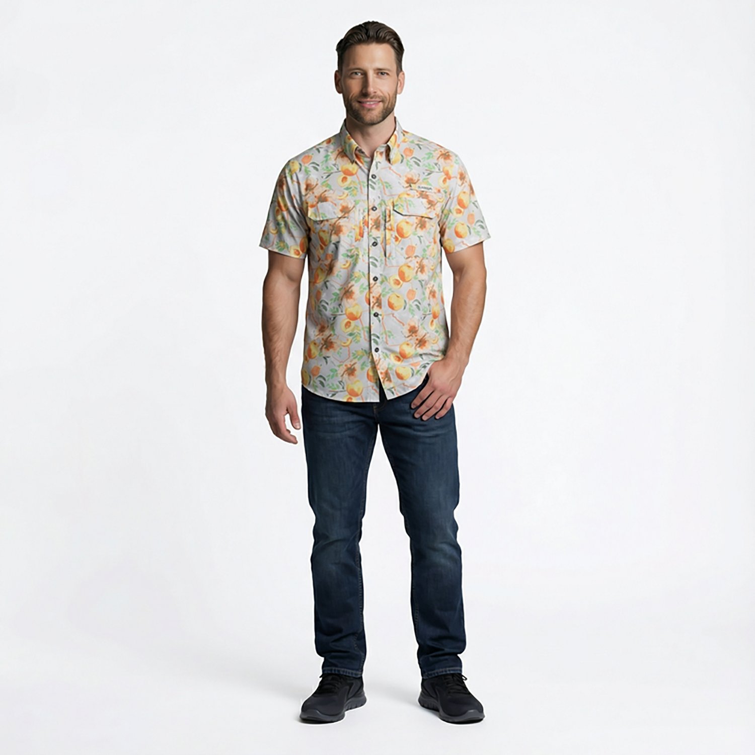 Show everyone where you're from with the Magellan Outdoors Men's Georgia Local State Print Shirt. This button-down shirt is made of polyester twill with moisture-wicking technology for a dry, comfortable feel. The graphic design highlights your southern roots. UPF 30 sun protection. Short sleeves.