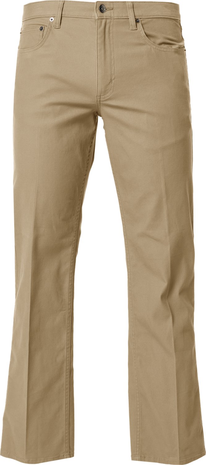 Look your best in the Magellan Outdoors Men's Heritage 5 Pocket Pants. They are made of 98% cotton and 2% spandex, and the flex technology enhances mobility. The water-repellent fabric helps keep you dry. Front zip fly closure.