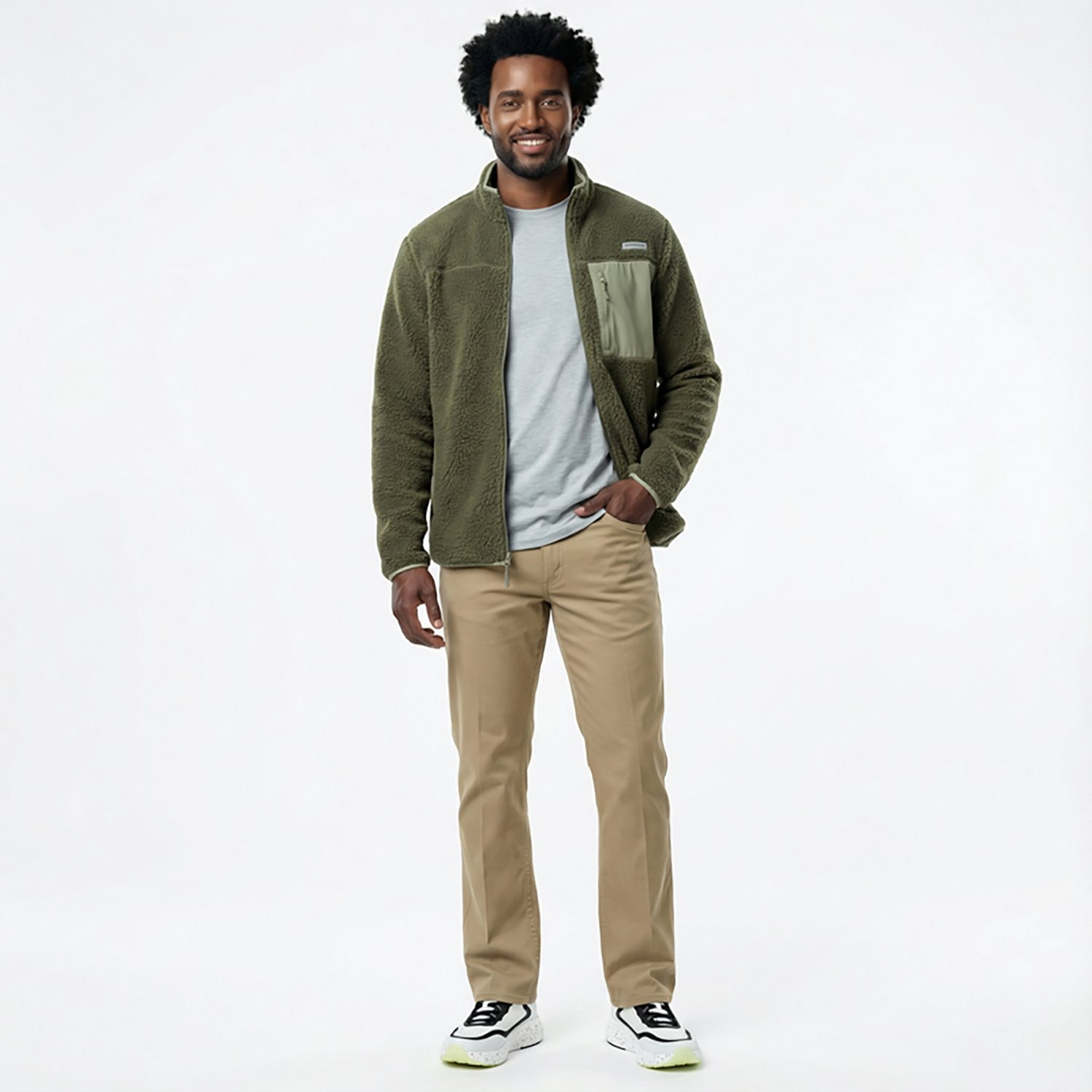 Front zip fly closure secures the pants